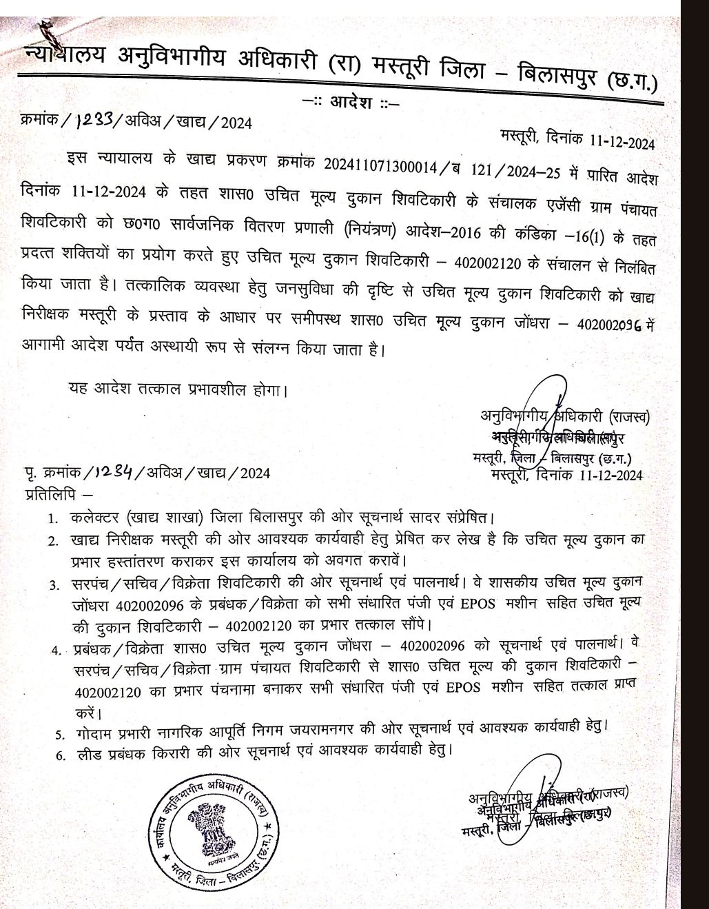 सार्वजनिक वितरण प्रणाली के तहत खाद्यान्न वितरण में गड़बड़ी…मस्तूरी विकासखंड के 5 राशन दुकान हुए निलंबित,