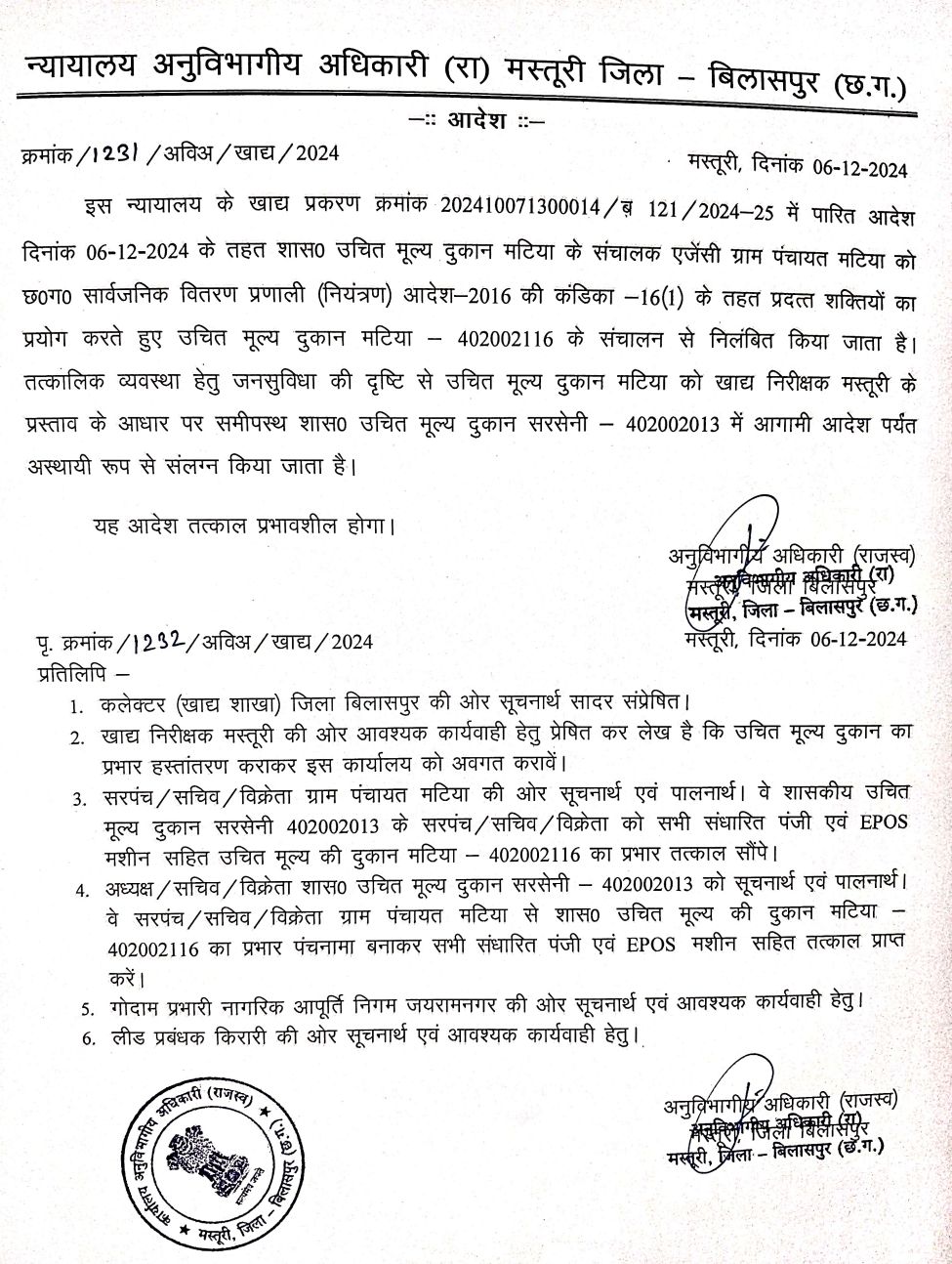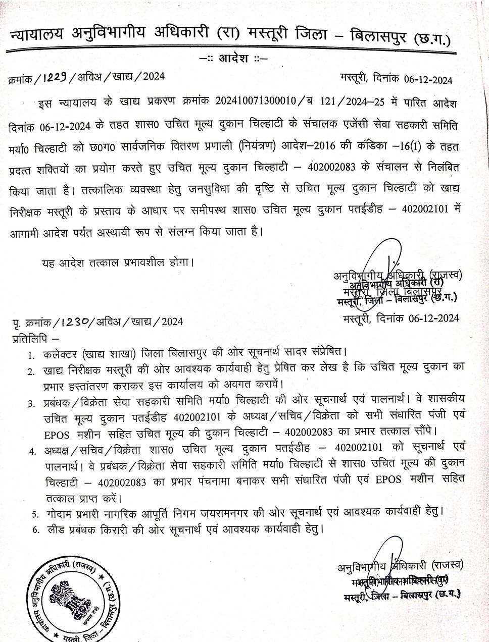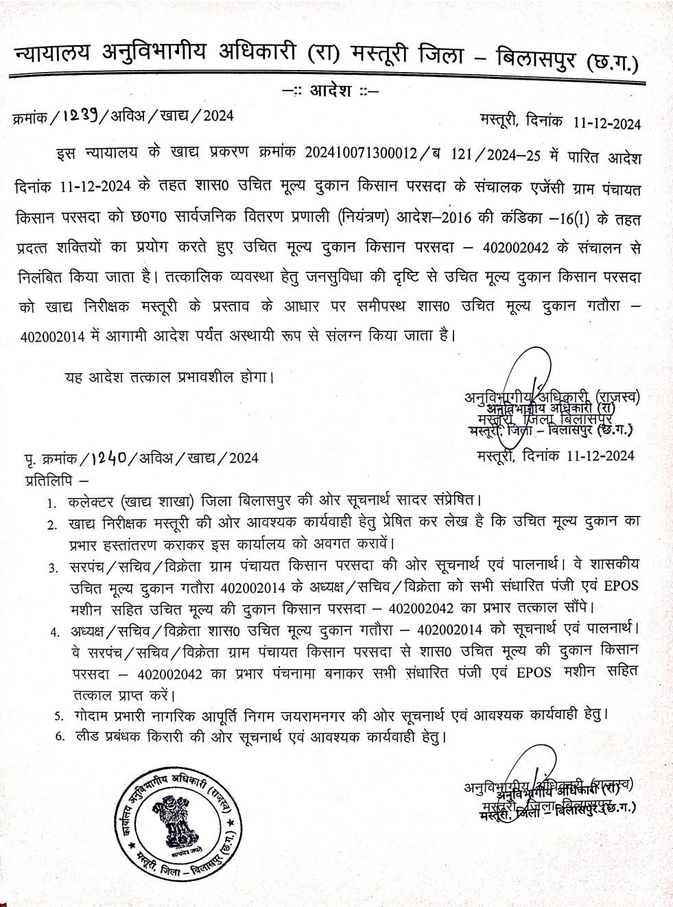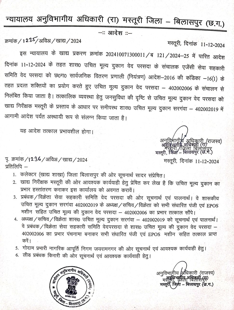 बिलासपुर – मस्तूरी विकासखंड अंतर्गत आने वाले 5 राशन दुकानो को अनुविभागीय अधिकारी मस्तूरी ने आदेश जारी कर निलंबित कर दिया है, जिनके संचालक एजेंसियों पर कार्रवाई की गई है। जिनमे ग्राम चिल्हाटी, किसान परसदा, शिवटिकारी, वेद परसदा और मटिया की दुकाने शामिल है, जारी आदेश में मस्तूरी एस डी एम ने निलंबित करते हुए समीपस्थ ग्राम के राशन दुकान से उक्त दुकानों को संलग्न कर दिया है।