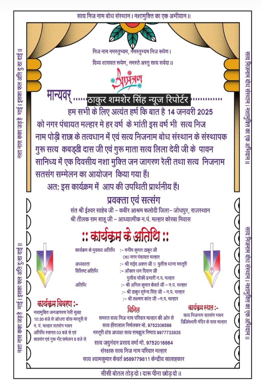 मल्हार – सत्य निज नाम बोध संस्था द्वारा इस वर्ष भी मकर संक्रांति के अवसर पर 14 जनवरी को नशामुक्ति जनजागरण रैली नगर में निकाली जाएगी इसके अलावा सत्संग का आयोजन भी होगा जिसमें छत्तीसगढ़ के विभिन्न जिलों से हजारों की संख्या में संस्था के सदस्य शिरकत करेंगे।