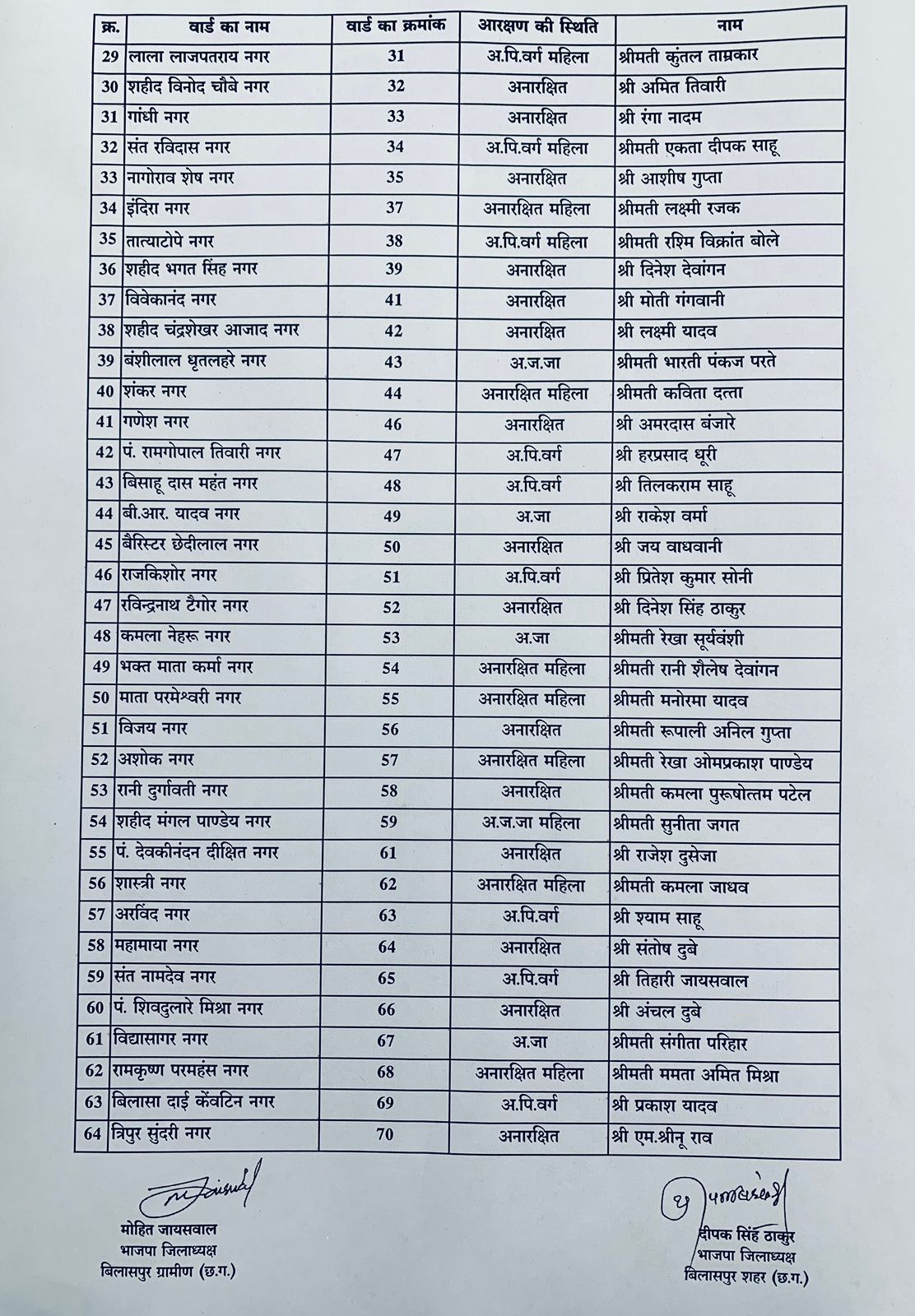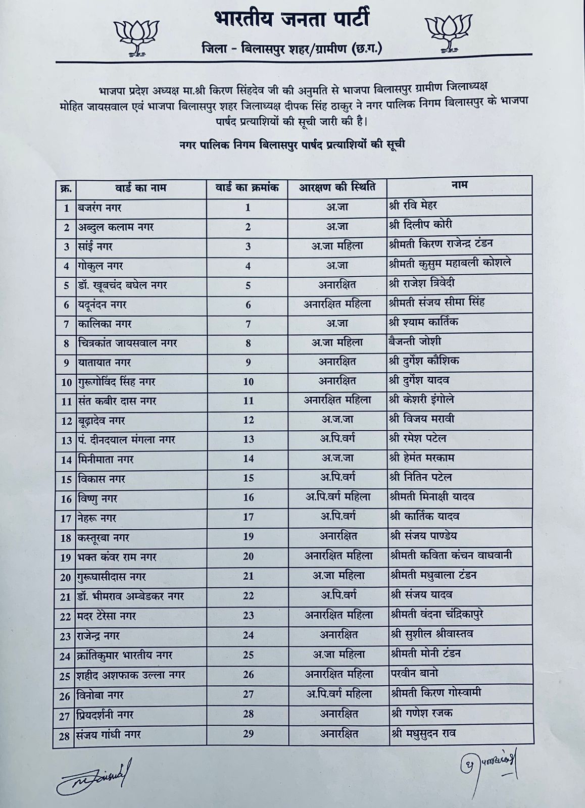 बिलासपुर – प्रत्याशियों की घोषणा के क्रम में भाजपा ने अब बिलासपुर नगर पालिक निगम के 70 में से 64 भाजपा पार्षद प्रत्याशीयो की घोषणा की है, देखिए पूरी लिस्ट…