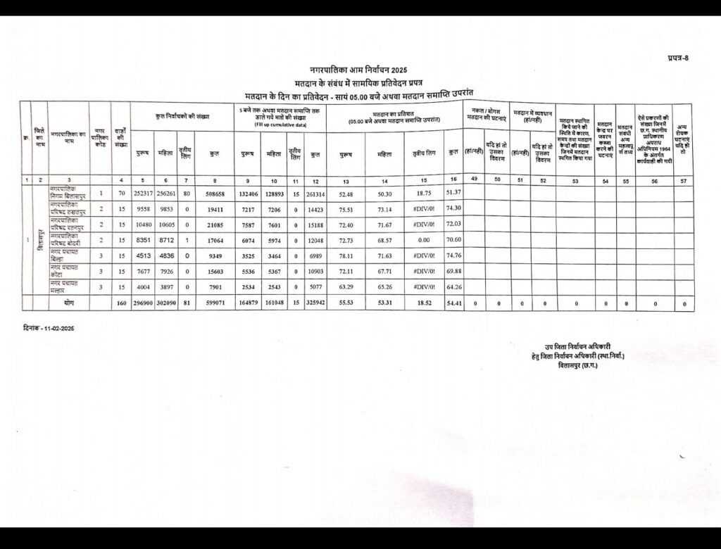 बिलासपुर – छत्तीसगढ़ में नगरपालिका आम निर्वाचन 2025 के तहत मतदान की प्रक्रिया शांतिपूर्ण रूप से संपन्न हुई। शाम 5 बजे तक की स्थिति के अनुसार बिलासपुर जिले में कुल 54.41% मतदान दर्ज किया गया। बिलासपुर जिले की विभिन्न नगर पालिकाओं में मतदान का प्रतिशत संतोषजनक रहा। सबसे अधिक मतदान नगर पंचायत बिल्हा में 74.76% रहा, जबकि नगर पालिक निगम बिलासपुर में सबसे कम 51.37% दर्ज किया गया।