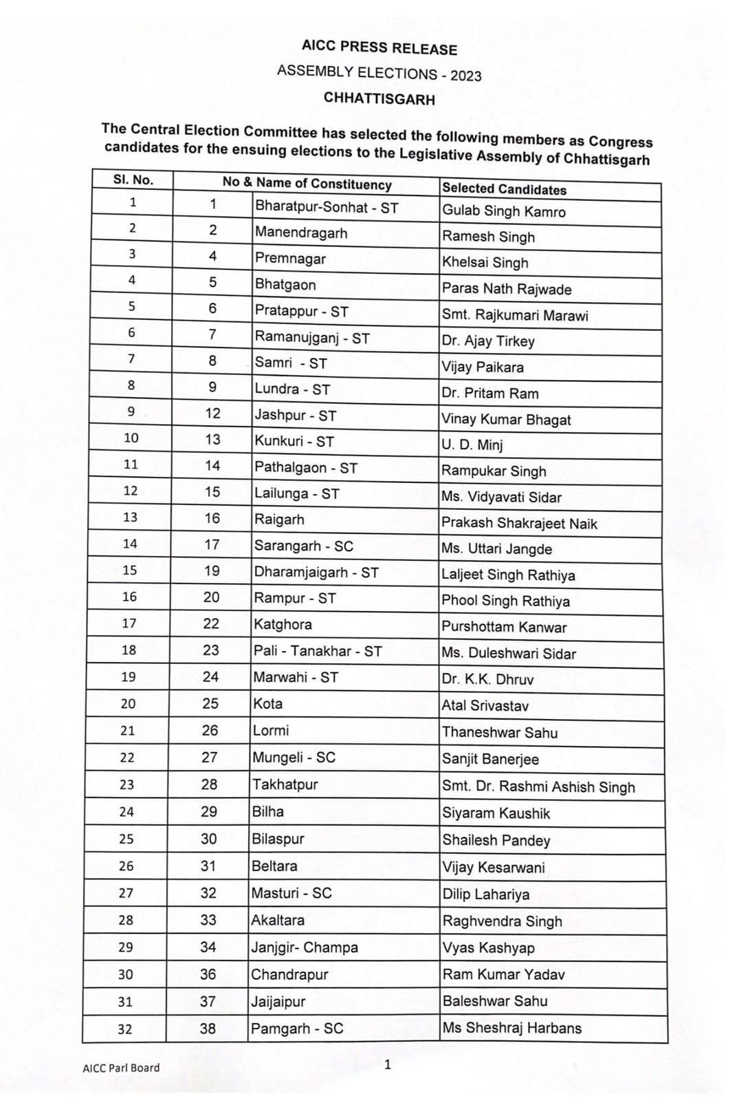 कांग्रेस के विधानसभा प्रत्याशियों की दूसरी लिस्ट जारी….बिलासपुर से शैलेश, बेलतरा से विजय और मस्तूरी से दिलीप को मिली टिकट