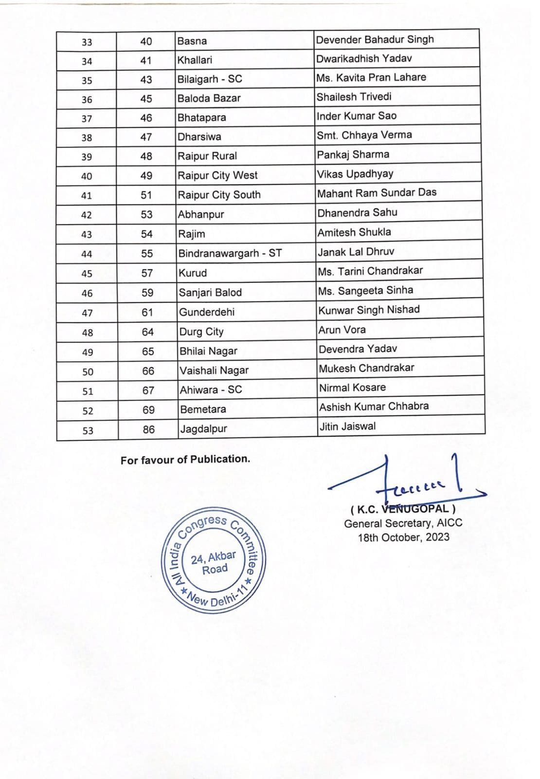 रायपुर – प्रदेश में विधानसभा चुनाव को लेकर 53 प्रत्याशियों की लिस्ट आज शाम जारी कर दिया गया है, जिसमें प्रतिक्षत बिलासपुर से शैलेश पांडेय, बेलतरा से विजय केशरवानी, मस्तूरी से दिलीप लहरिया, बिल्हा से सियाराम कौशिक सहित अन्य प्रत्याशियों के नाम लिस्ट में शामिल है, जिन्हें कांग्रेस का चेहरा बनाया गया है।