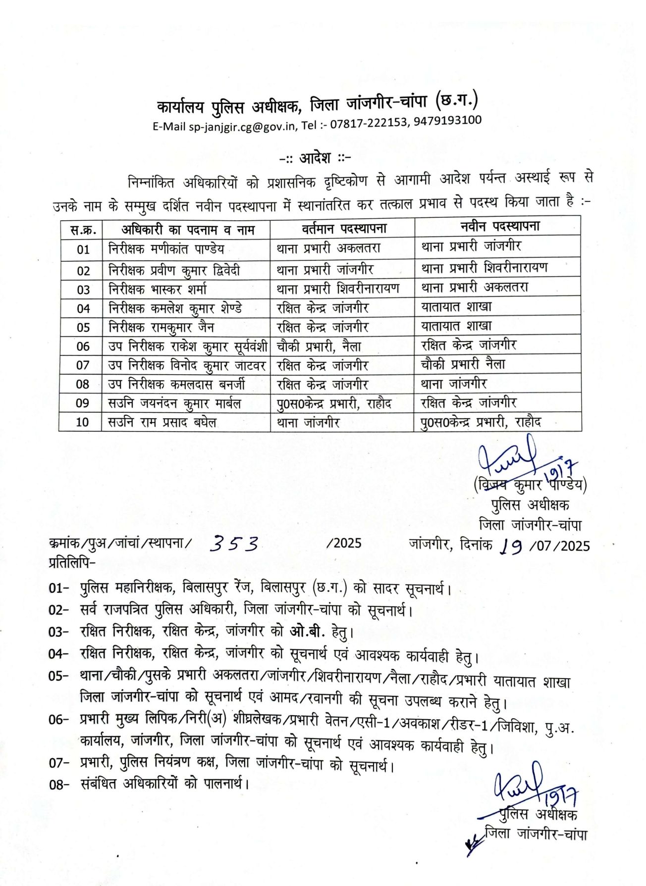 जांजगीर चाम्पा – जिले के विभिन्न थाना और चौकियों में तैनात प्रभारियों का तबादला किया गया है। एसपी ने आदेश जारी कर 5 निरीक्षक और 3 उप निरीक्षक, 2 सहायक उप निरीक्षकों को इधर से उधर किया है….देखिए आदेश