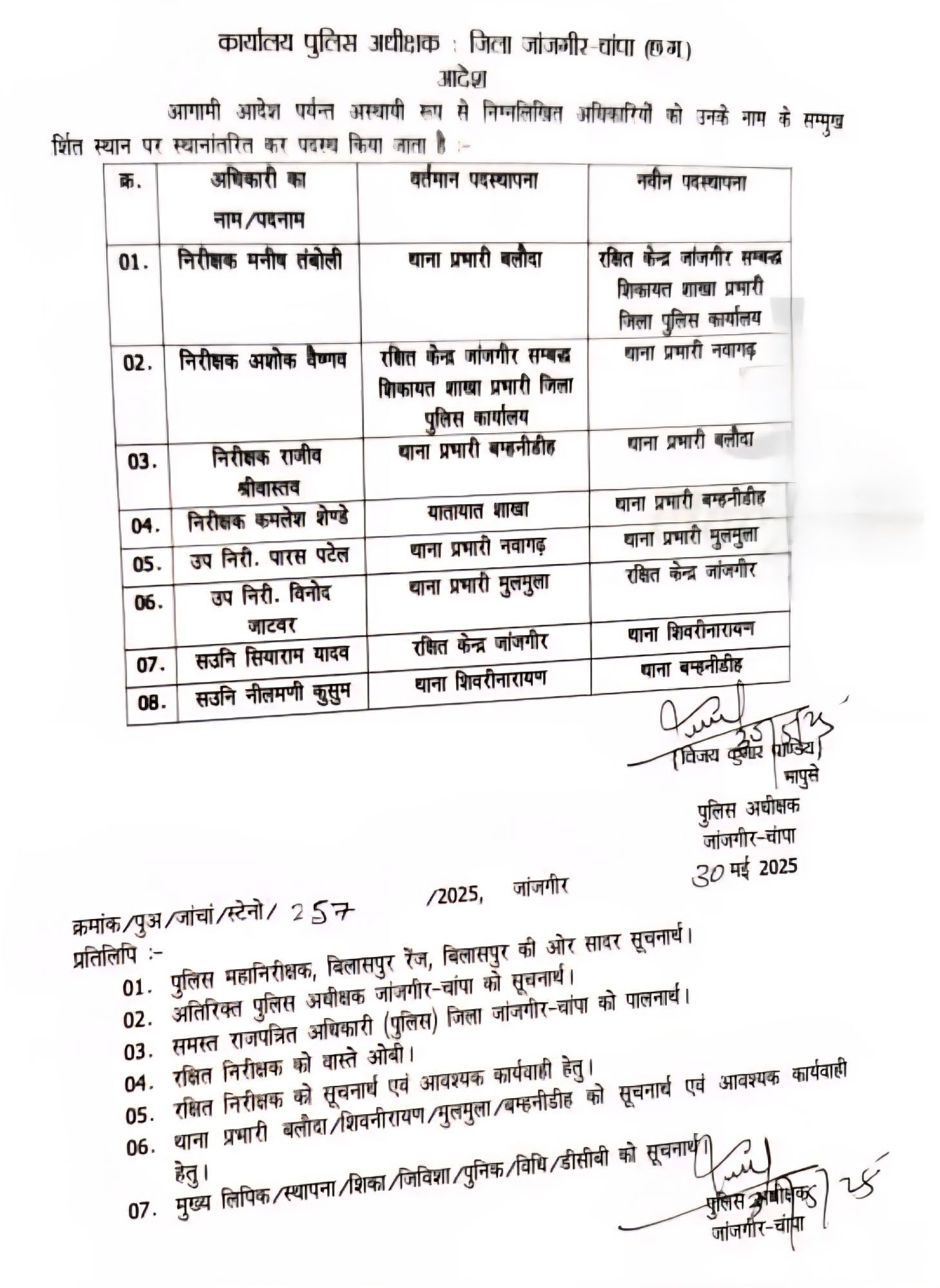 इसी प्रकार निरीक्षक अशोक वैष्णव को थाना प्रभारी नवागढ़, निरीक्षक कमलेश शेंडे को थाना प्रभारी बम्हनीडीह, उपनिरी पारस पटेल को थाना नवागढ़ से थाना प्रभारी मुलमुला, उपनिरी. विनोद जटवार थाना प्रभारी मुलमुला जो लंबे समय से मेडिकल पर चल रहे थे जिनको थाना मुलमुला से रक्षित केंद्र पदस्थ किया गया है, तथा सउनि सियाराम यादव को रक्षित केन्द्र जांजगीर से थाना शिवरीनारायण एवं सउनि नीतमणी कुसुम थाना शिवरीनारायण को थाना बम्हनीडीह में पदस्थ किया गया है।
