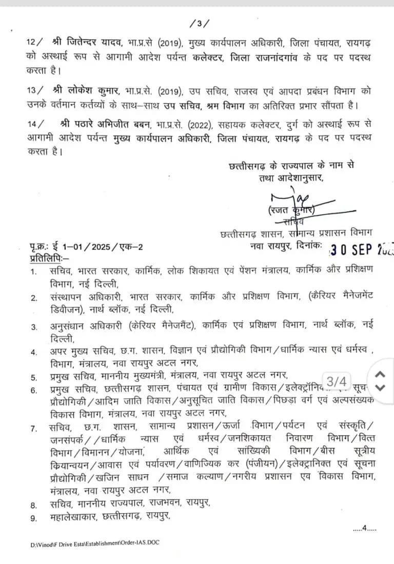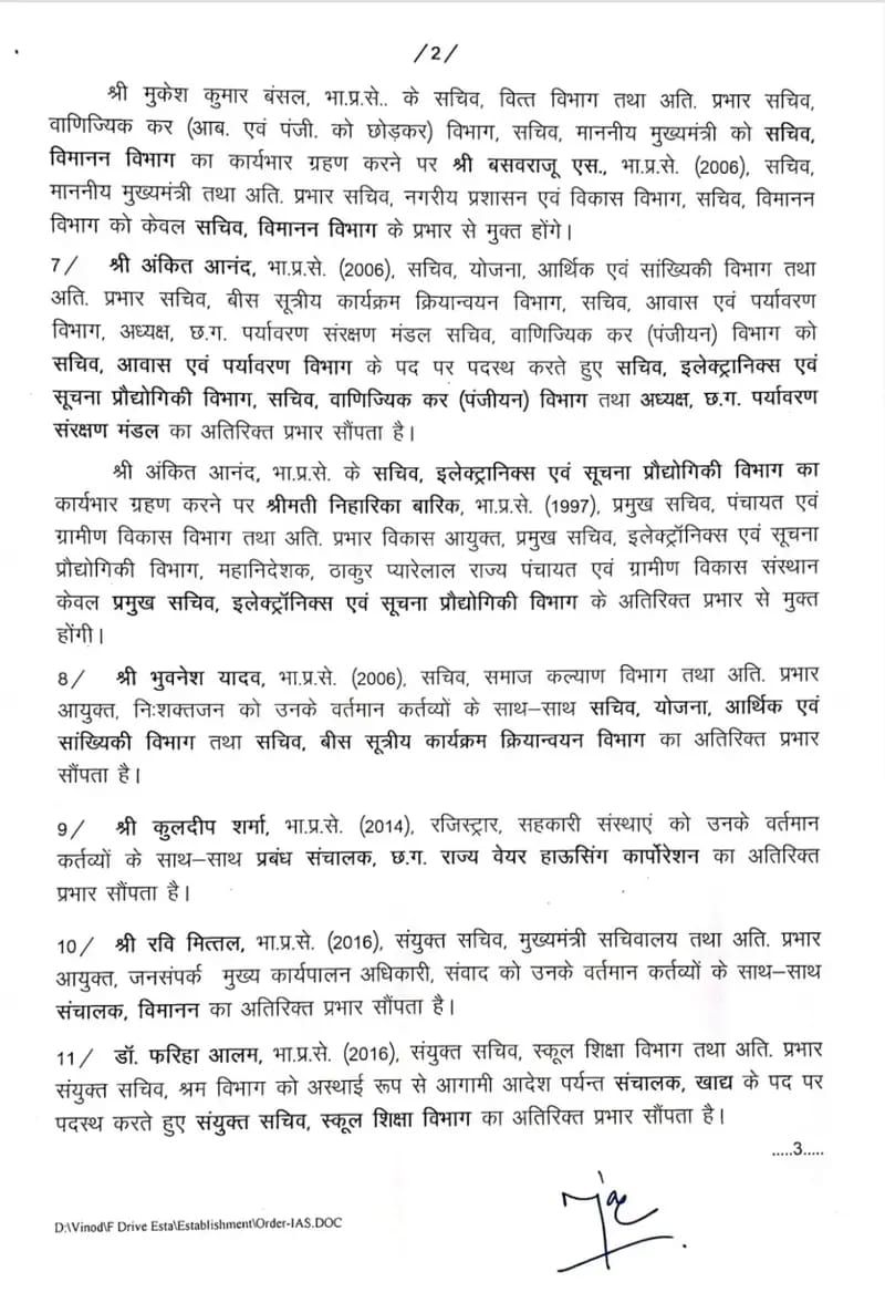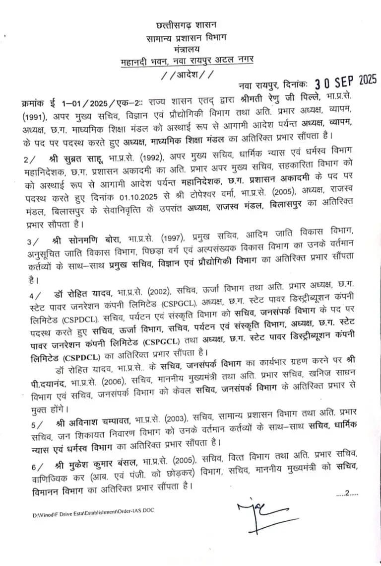 रायपुर – प्रदेश के मुख्य सचिव के रूप में आईएएस विकासशील के पदभार संभालने के बाद 14 आईएएस अधिकारियों के प्रभार में बदलाव किया गया है। जिसमें प्रमुख सचिव से लेकर कलेक्टर तक प्रभावित हुए है, देखिए आदेश….