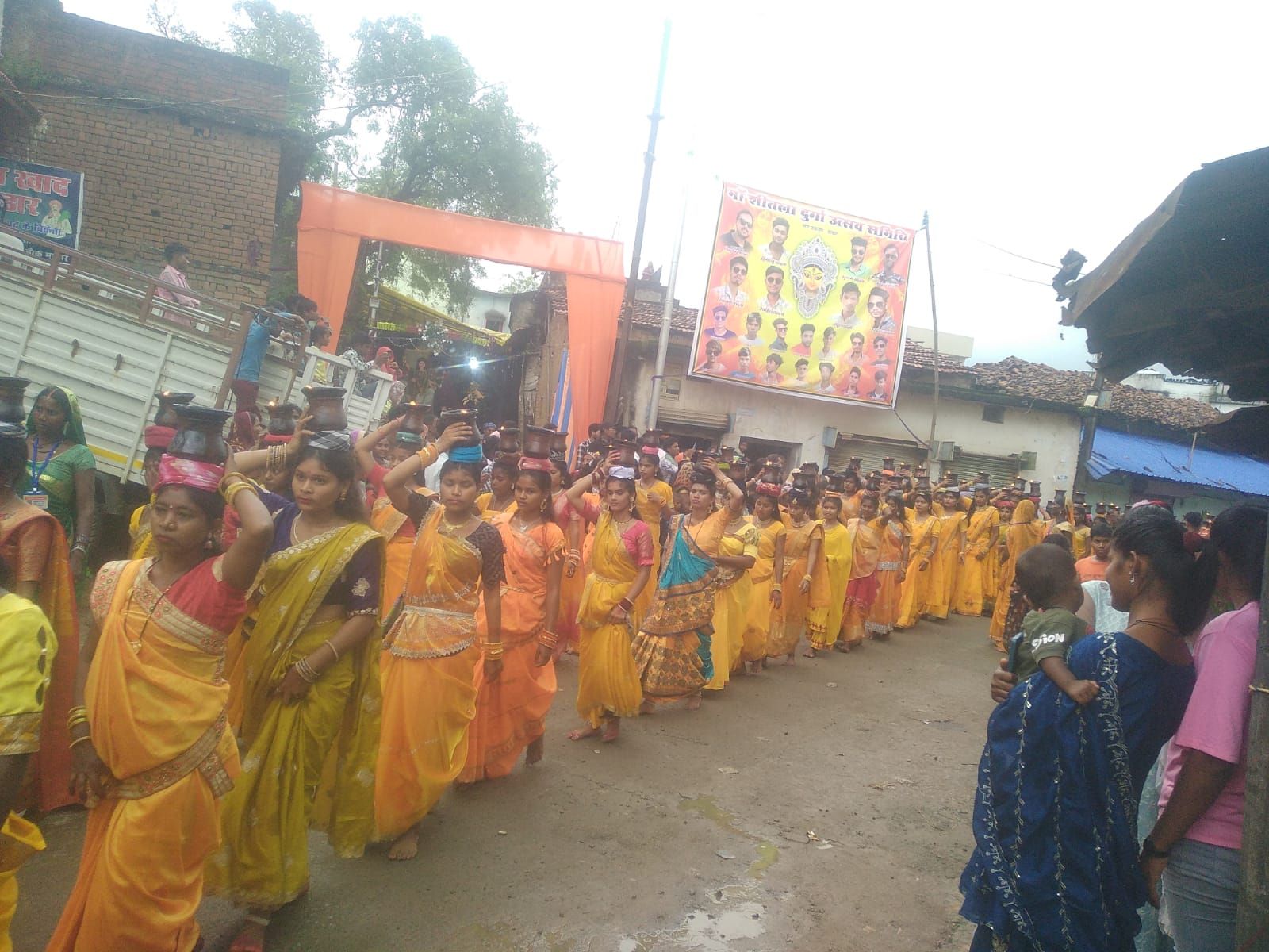 जिन्होंने पीली व लाल साड़ी धारण कर कतारबद्ध होकर कलशयात्रा को खूबसूरत बना दिया। झांझ मंजीरों के धुन में नाचते गाते लोगो ने कलशयात्रा की अगुवाई करते हुए नगर भ्रमण किया। मंदिर से निकली कलशयात्रा ठाकुरदेव चौक, बाजार चौक, स्कूल चौक होते हुए मेला चौक स्थित भगवान पातालेश्वर मंदिर पहुची जहां पूजा पाठ के बाद पौराणिक महत्व के खैया तालाब में जंवारा विसर्जन किया गया।