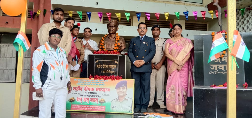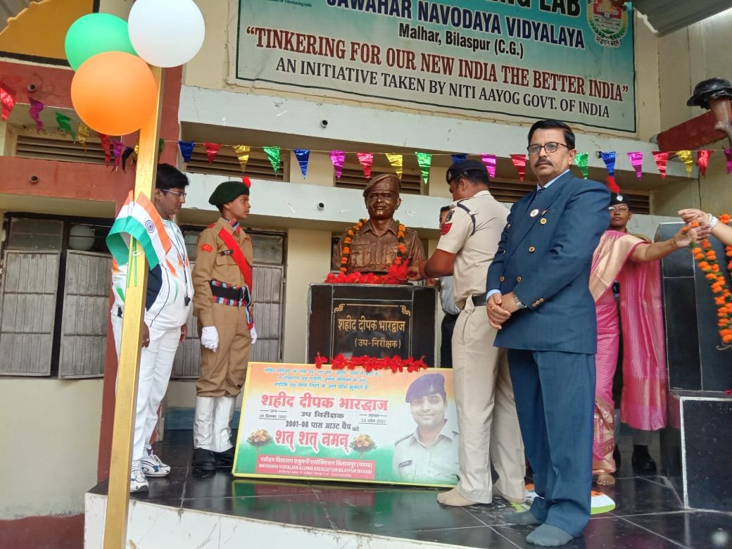 मल्हार – 15 अगस्त स्वतंत्रता दिवस के अवसर पर मल्हार स्थित नवोदय विद्यालय में नक्सलियों के साथ बीते वर्ष मुड़भेड़ में शहीद हुए उप निरीक्षक दीपक भारद्वाज को याद करते हुए, उनके प्रतिमा में माल्यार्पण कर उन्हें श्रद्धांजलि दी गई, जहाँ मल्हार चौकी प्रभारी मनोज पटेल सहित चौकी के समस्त स्टाफ एवं नवोदय विद्यालय के बच्चे उपस्थित रहे। जहाँ शहीद दीपक भारद्वाज के बलिदान पर प्रकाश डालते हुए बताया गया कि शहीद दीपक ने अपनी 12वी तक की पढ़ाई मल्हार नवोदय विद्यालय से ही पूरी की थी। जिससे वजह से दीपक भारद्वाज की यादें मल्हार नवोदय विद्यालय से जुड़ी हुई है। दीपक भारद्वाज ने सरस्वती शिशु मंदिर पिहरीद में पढ़ाई की, इसके बाद कक्षा छठवीं से 12वीं तक की पढ़ाई जवाहर नवोदय विद्यालय मल्हार में की, जबकि स्नातक की पढ़ाई सीएमडी कॉलेज बिलासपुर की थी, उन्होंने गुरु घासीदास यूनिवर्सिटी बिलासपुर से स्नातक की पढ़ाई के दौरान 2011 में सब इंस्पेक्टर पुलिस की भर्ती में आवेदन किया था. इस दौरान वह प्रथम प्रयास में ही सब इंस्पेक्टर पद के लिए चयनित हुए थे. सब इंस्पेक्टर ट्रेनिंग के बाद रायपुर,