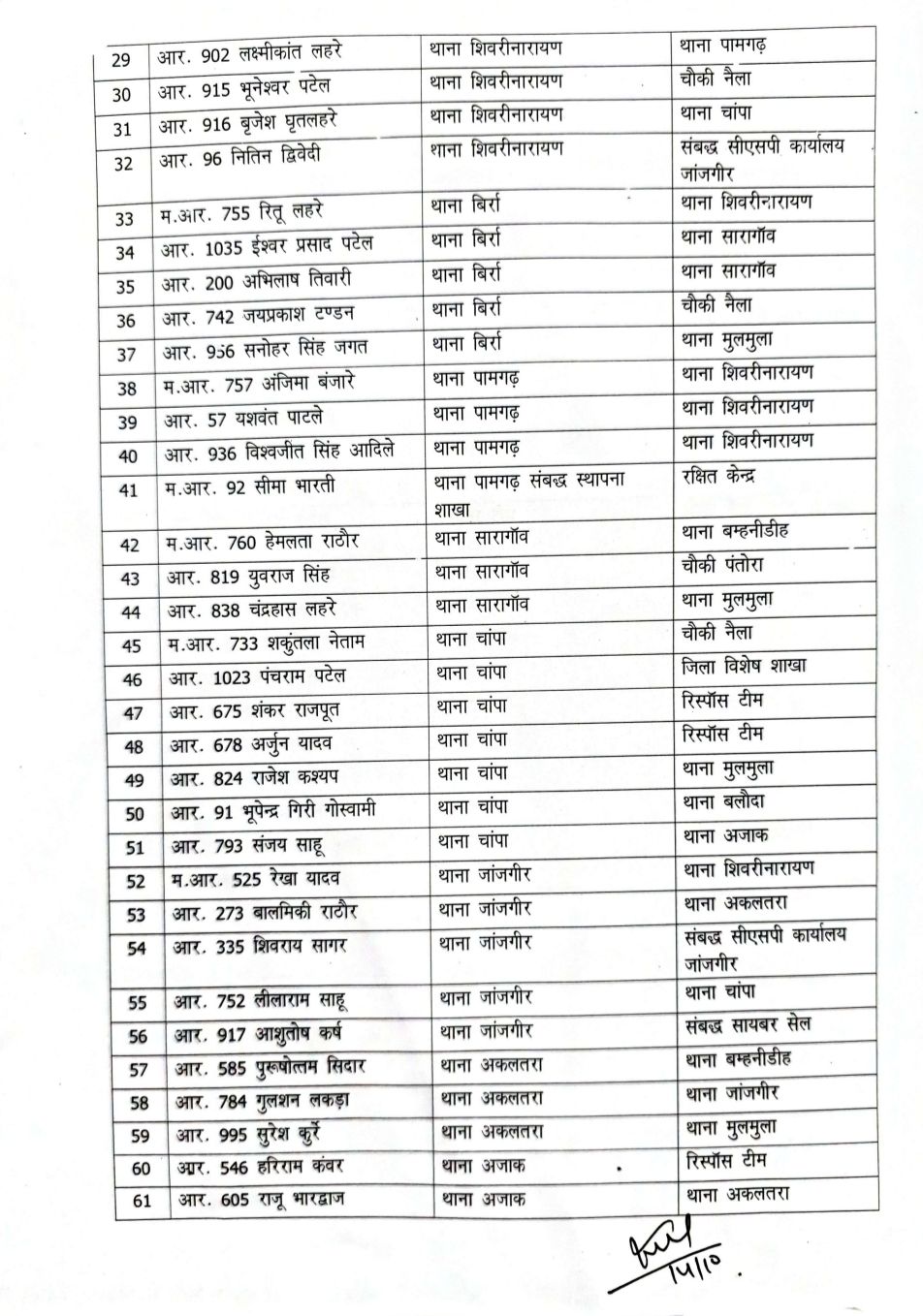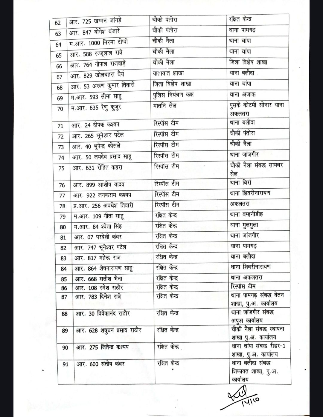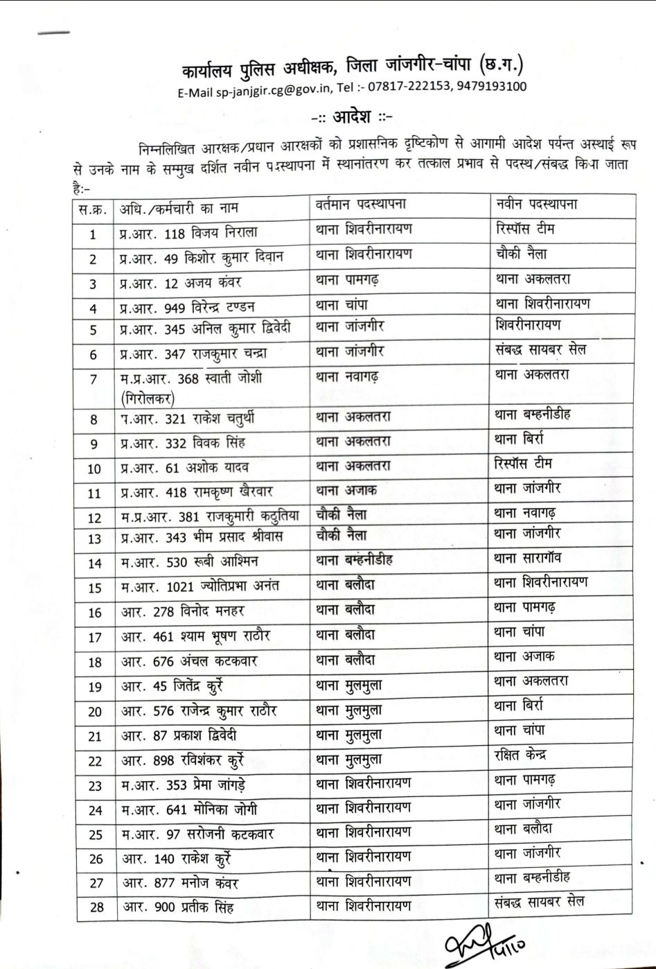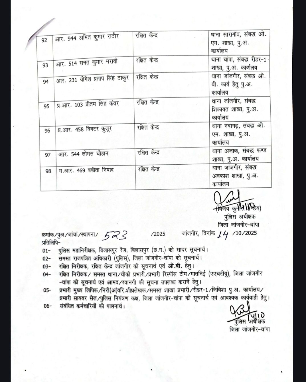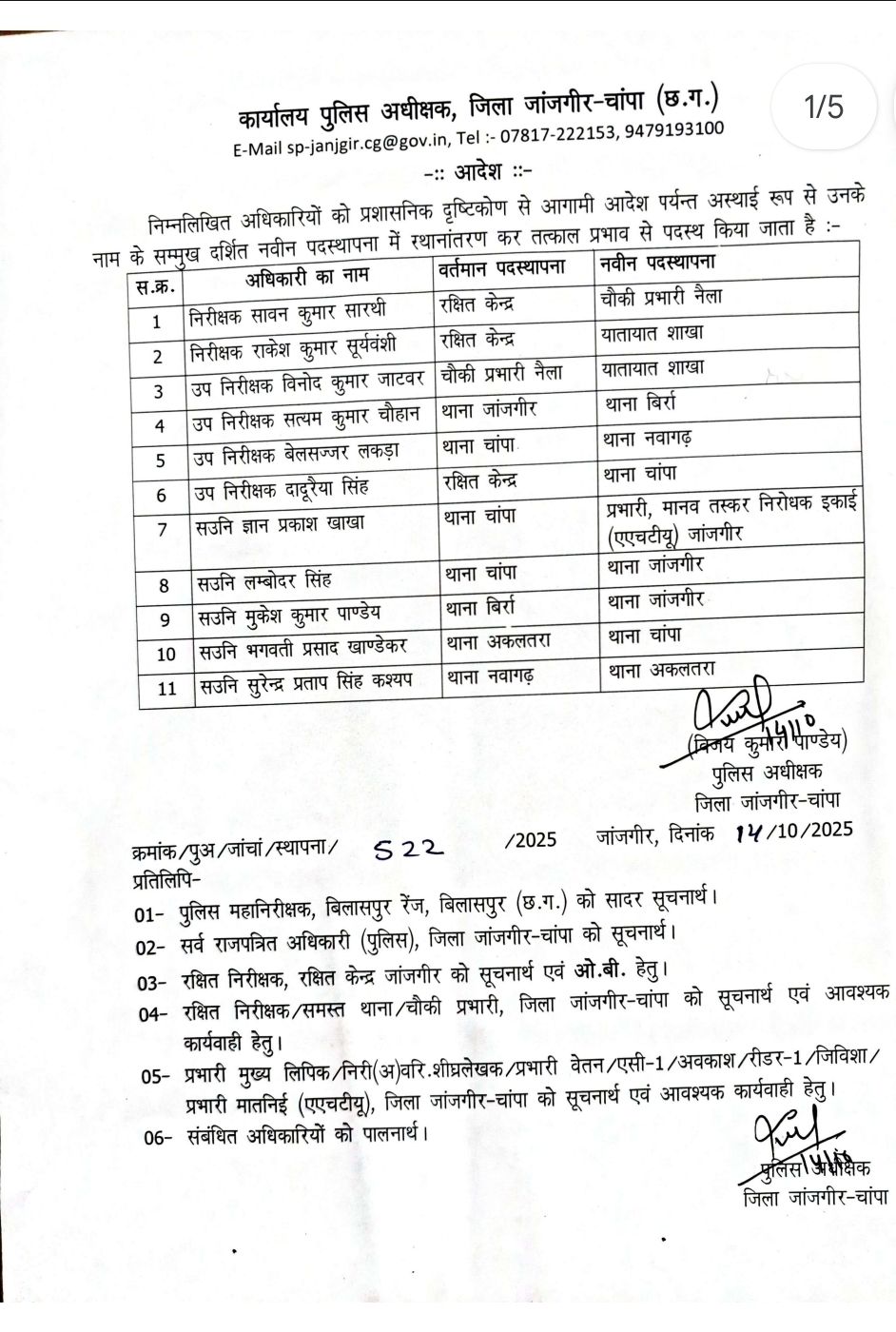 जांजगीर चाम्पा – जिले में पुलिस अधीक्षक विजय कुमार पांडेय ने 100 से अधिक पुलिस कर्मियों का तबादला आदेश जारी किया है। दीपावली से पहले हुई इस बड़ी संख्या में फेरबदल को प्रशासनिक दृष्टिकोण से कसावट के रूप में देखा जा रहा है, जिसमें निरीक्षक से लेकर आरक्षक तक पुलिस कर्मी प्रभावित हुए है।