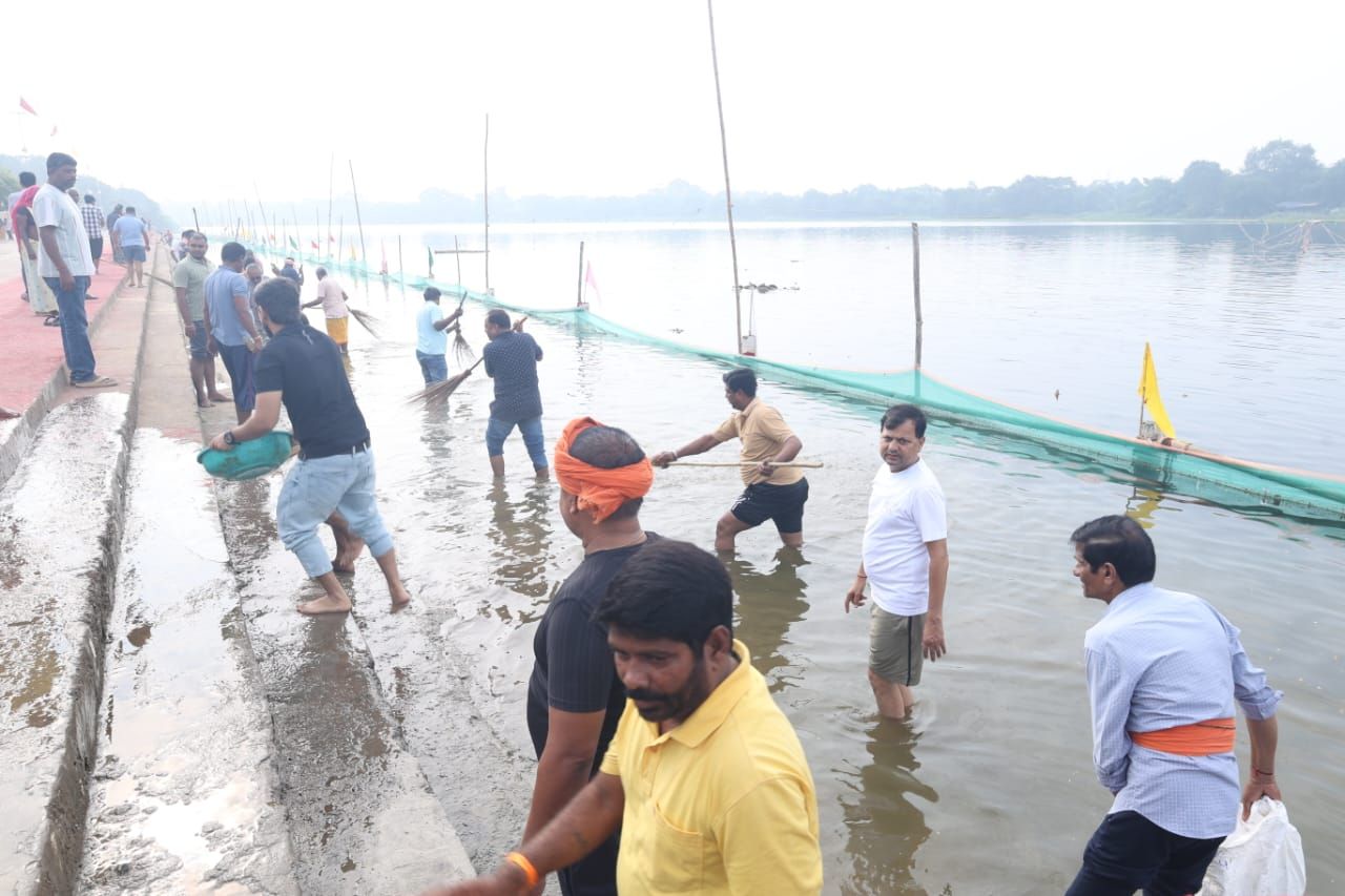 बिलासपुर – संस्कारधानी बिलासपुर में सूर्य उपासना का सबसे बडा महापर्व प्रारंभ हो चुका है। 25 अक्टूबर शनिवार को अरपा मैया की महाआरती की गई और आज एशिया के सबसे बड़े स्थाई छठ घाट पर बड़ी संख्या में स्वयंसेवकों ने श्रमदान करके घाट की सफाई पूर्ण कर लि है। सुबह 7 बजे से नदी और घाट की साफ सफाई प्रवीण झा के नेतृत्व में की गई इस दौरान भक्तों में उत्साह देखने लायक था। बिलासपुर का तोरवा छठ घाट एशिया का सबसे बड़ा स्थाई छठ घाट है। लगभग 7.5 एकड़ में फैले इस भव्य घाट पर श्रद्धालुओं की भीड़ देखते ही बनती है। महापर्व के दूसरे दिन आज रविवार सुबह से समिति के सभी स्वयंसेवकों ने स्वच्छता अभियान के लिए श्रमदान किया। घाट प्रांगण एवं घाट के निचे पानी में सफाई की गई। इसके अलावा सभी सदस्यों ने झाड़ू लेकर पूरे घाट की सफाई की।