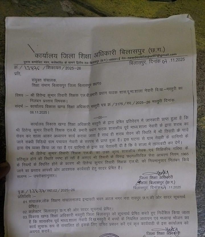 इधर मामले में ग्रामीणों के अनुसार, यह कोई नई बात नहीं है बल्कि यह शिक्षक लगभग रोजाना ही नशे की हालत में स्कूल आता है और बच्चों के बीच शर्मनाक हरकतें करता है। मामले को जब मीडिया में उठाया गया। तब शिक्षा विभाग का अमला हरकत में आया और मस्तूरी बीईओ से जांच करा कर तत्काल डीईओ विजय टांडे द्वारा प्रधानपाठक हितेंद्र तिवारी को निलंबित करने के लिए प्रतिवेदन संयुक्त संचालक कार्यालय में प्रेषित किया है। सूत्रों की माने तो डीईओ कार्यालय से पूरे प्रकरण की जानकारी सयुक्त संचालक आरपी आदित्य को दी जा चुकी थी।