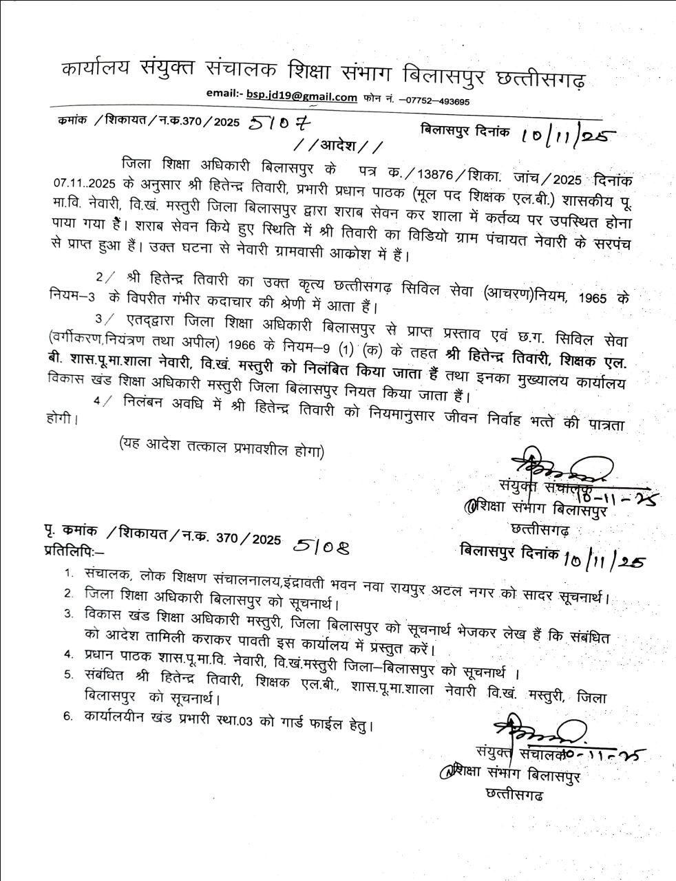 बिलासपुर – एकबार फिर जिले में सत्याग्रह की खबर का असर हुआ है। जहां मस्तूरी ब्लॉक के शराबी प्रधानपाठक के ऊपर कार्यवाही में हो रही लेट लतीफी को लेकर सत्याग्रह न्यूज द्वारा प्रमुखता से खबर प्रकाशित की गई थी। जिसके बाद जिला प्रशासन के आला अफसरों ने घटना को संज्ञान में लेते हुए उचित कार्यवाही के निर्देश दिए थे। जिसके बाद सोमवार को संयुक्त संचालक आरपी आदित्य द्वारा प्रधानपाठक हितेंद्र कुमार तिवारी को निलंबित कर दिया है। आपको बता दे कि बीते गुरुवार को धनगंवा संकुल के अंतर्गत ग्राम पंचायत नेवारी में स्थित शासकीय पूर्व प्राथमिक शाला के प्रधानपाठक हितेंद्र कुमार तिवारी शराब के नशे में धुत होकर विद्यालय पहुंचे। प्रधानपाठक हितेंद्र कुमार तिवारी शराब के नशे में इतने अधिक मदहोश थे कि वे ठीक से खड़े भी नहीं हो पा रहे थे। जिसका विडियो बनाया गया था। इस वीडियो में साफ दिखाई दे रहा था। कि मासूम स्कूली बच्चे उन्हें उठाने की कोशिश कर रहे हैं, जबकि शिक्षक लड़खड़ाते हुए गिर पड़ते हैं।