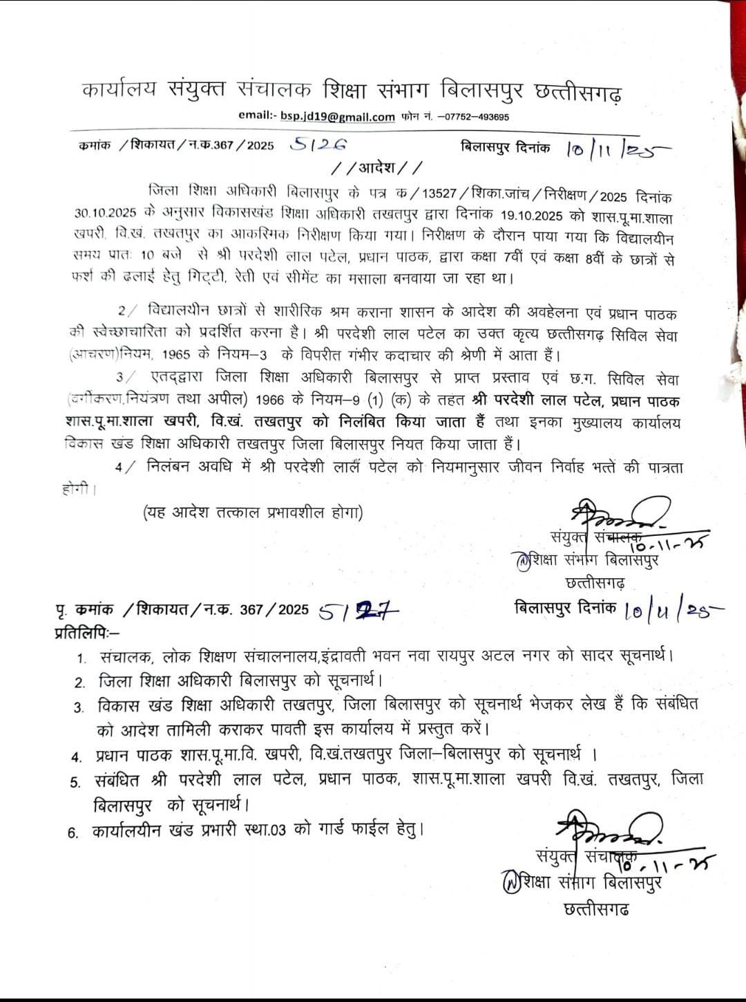 बिलासपुर – शासकीय स्कूल के बच्चो को श्रमिक की तरह काम कराने वाले प्रधान पाठक को सयुक्त संचालक ने निलंबित कर दिया है। मिली जानकारी के अनुसार यह पूरा मामला तखतपुर ब्लॉक के अंर्तगत शासकीय पूर्व माध्यमिक शाला खपरी का है। जहा 19 अक्टूबर 2025 को आकस्मिक निरीक्षण के लिए तखतपुर के बीईओ पहुंचे थे। इसी दौरान स्कूल में पढ़ाई के समय में प्रधान पाठक परदेशी लाल पटेल द्वारा कक्षा सातवी और आठवीं के बच्चों से फर्श की ढलाई के लिए गिट्टी, रेत और सीमेंट का मसाला बनवाया जा रहा था।