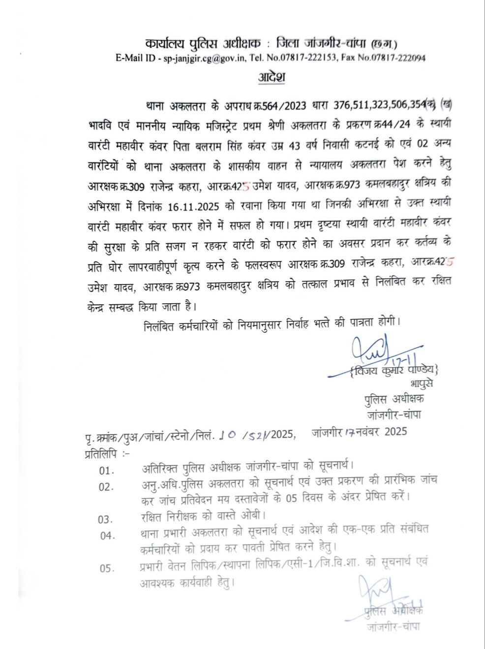 जांजगीर – जिले के एसपी विजय कुमार पांडेय ने अकलतरा थाने के 3 आरक्षकों को सस्पेंड कर दिया है, मामले में मिली जानकारी के अनुसार यह कार्रवाई पुलिस अभिरक्षा से एक आरोपी के फरार होने के बाद कि गई है। आरोपी स्थायी वारंटी महावीर कंवर पिता बलराम सिंह कंवर उम्र 43 वर्ष निवासी कटनई एवं 2 अन्य आरोपियों को 16.11.2025 को अकलतरा न्यायालय ले जाया जा रहा था,