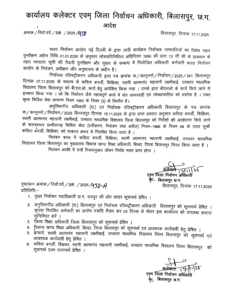 बिलासपुर – बीएलओ ड्यूटी करने से मना करना एक शिक्षिका को भारी पड़ गया। जहां जिला निर्वाचन अधिकारी ने शिक्षिका को तत्काल प्रभाव से निलंबित कर दिया है। मिली जानकारी के अनुसार भारत निर्वाचन आयोग नई दिल्ली के द्वारा निर्वाचक नामावली का गहन पुनरीक्षण कार्य के तहत मतदाता सूची की तैयारी, पुनरीक्षण और सुधार के संबंध में नियोजित अधिकारी कर्मचारी के द्वारा नियोजित अधिकारियों को भारत निर्वाचन आयोग के नियंत्रण,अधीक्षण और अनुशासन के अधीन कर दिया है। निर्वाचक रजिस्ट्रीकरण अधिकारी बिलासपुर द्वारा सात नवंबर को आदेश जारी कर कविता बनर्जी शिक्षिका स्वामी आत्मानंद महारानी लक्ष्मीबाई उच्चतर माध्यमिक विद्यालय जिला बिलासपुर को बीएलओ कार्य हेतु आदेशित किया गया था। पर उनके द्वारा बीएलओ कार्य किए जाने से इंकार कर दिया गया। जो कि निर्वाचन जैसे महत्वपूर्ण कार्य में घोर लापरवाही और स्वेच्छाचारिता प्रदर्शित करता है। जिसके मद्देनजर मामले में बिलासपुर एसडीएम और निर्वाचन रजिस्ट्रीकरण अधिकारी मनीष साहू के द्वारा कलेक्टर को 15 नवंबर को प्रस्ताव जिला कलेक्टर संजय अग्रवाल को भेजा गया।