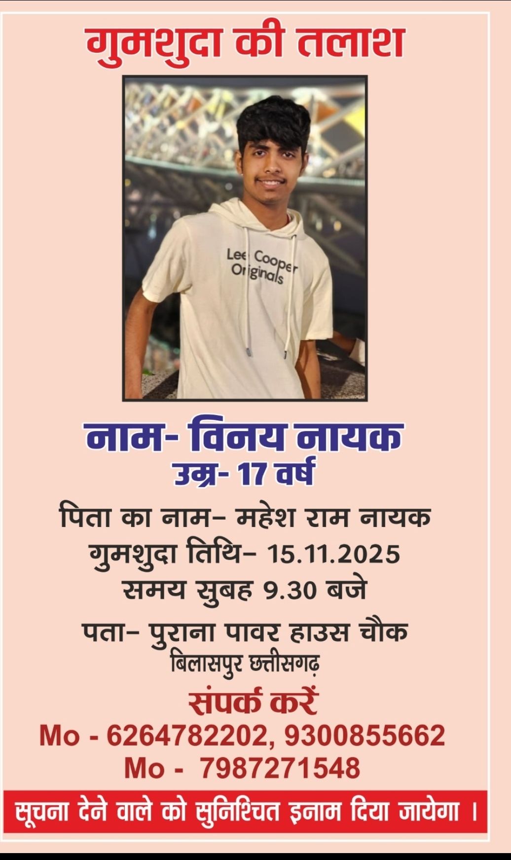 बिलासपुर – तोरवा थाना क्षेत्र अंतर्गत पावरहाउस चौक निवासी महेश नायक के पुत्र विनय नायक उम्र 17 वर्ष विगत 15.11.2025 की सुबह 9 बजे स्कूल जाने घर से स्कूटी क्रमांक CG10AH 8276 से लालखदान निकला था, लेकिन वह स्कूल नही पहुँचा, जब परिजनों ने उसकी तलाश की उसके मोबाईल पर कॉल किया तो उसने एक बार फोन उठाया लेकिन बात नही की जिसके बाद उसका मोबाइल बंद हो गया। आस पास रिश्तेदारों के पास तलाश करने के बाद परिजनों ने इसकी गुमशुदगी की रिपोर्ट तोरवा थाने में दर्ज कराई है,