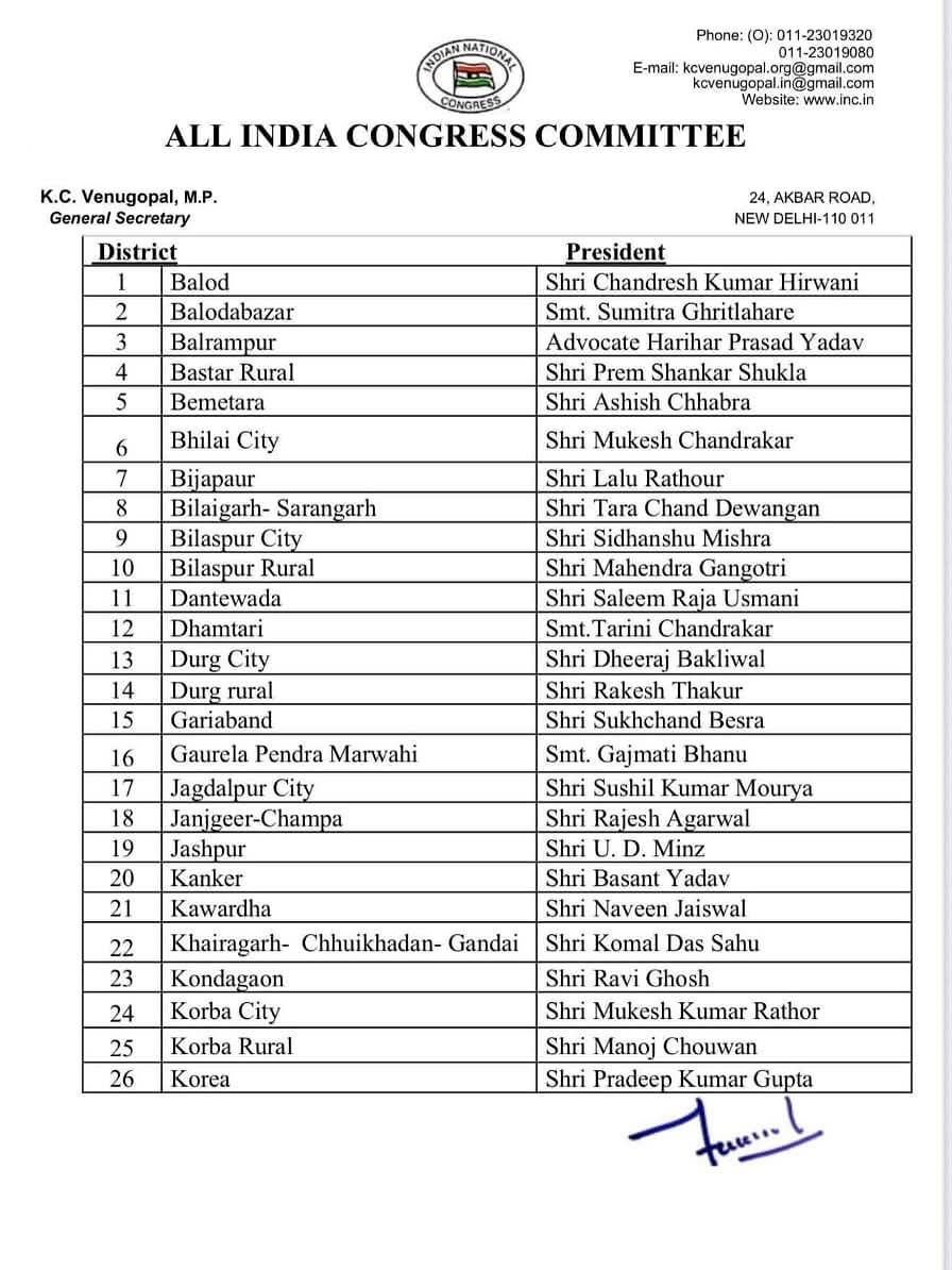 रायपुर – छत्तीसगढ़ कांग्रेस ने संगठन में बड़ा फेरबदल करते हुए 41 जिलाध्यक्षों की नई सूची जारी की है। पार्टी संगठन के अनुसार, इस बदलाव का उद्देश्य जमीनी स्तर पर संगठन को मजबूत करना और आगामी राजनीतिक गतिविधियों में नई ऊर्जा का संचार करना है। नई सूची के मुताबिक, रायपुर सिटी जिला अध्यक्ष की जिम्मेदारी श्रीकुमार शंकर मेनन को सौंपी गई है, जबकि रायपुर ग्रामीण में राजेंद्र पप्पू बंजारे को नई कमान मिली है।