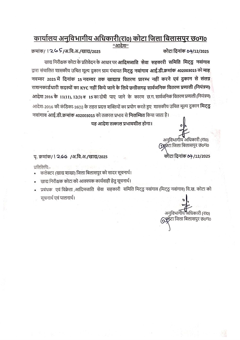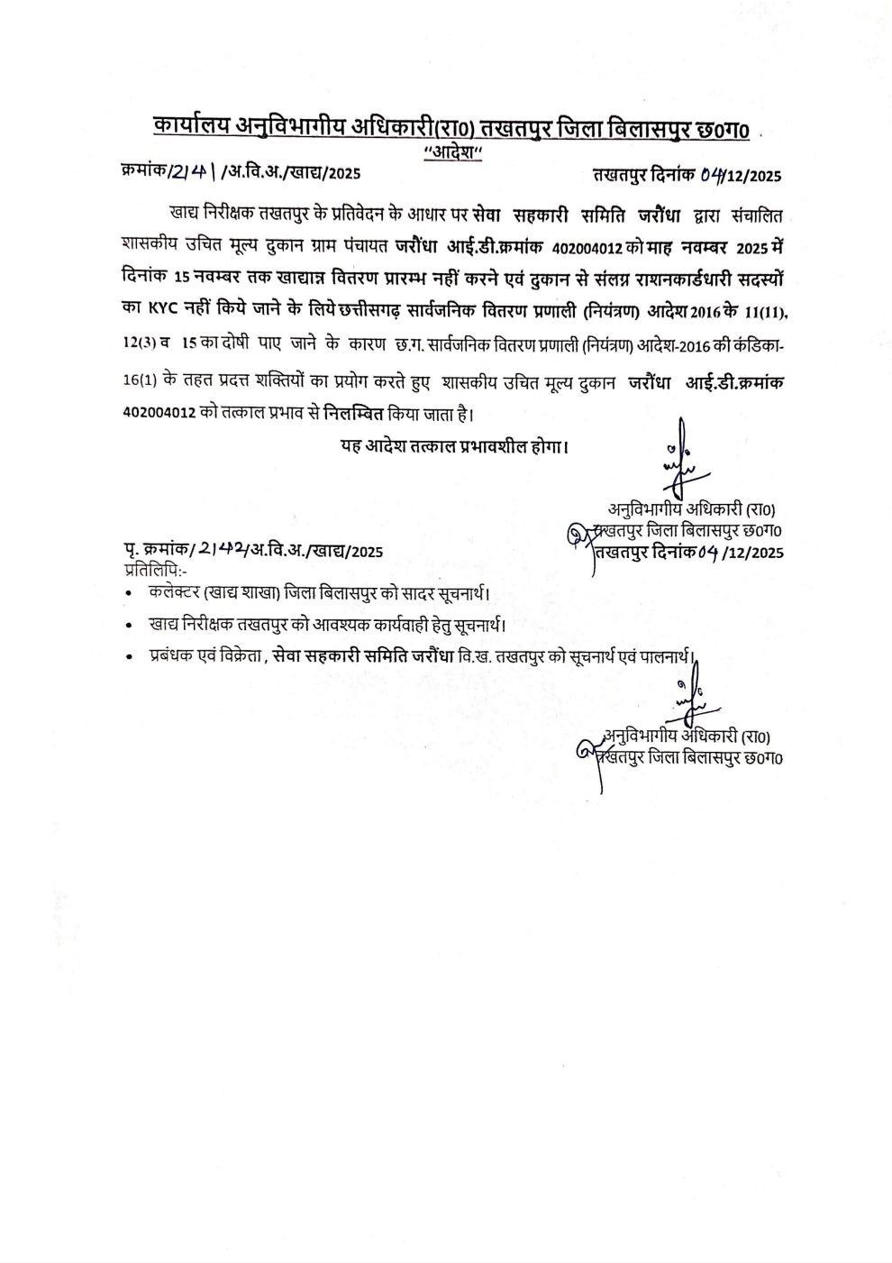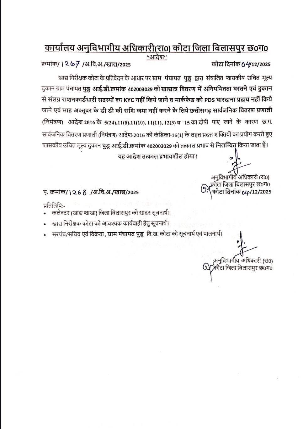 बिलासपुर – कोटा और तखतपुर क्षेत्र में उपभोक्ताओं को समय पर खाद्यान्न उपलब्ध नहीं कराने और ई-केवाईसी सहित अन्य अनियमितताओं पर प्रशासन ने सख्त रुख अपनाया है। एसडीएम ने कोटा के पुडु और मिट्ठू नवागांव, तथा तखतपुर क्षेत्र की जरौंधा शासकीय उचित मूल्य दुकानों को निलंबित कर दिया है। पुडु की उचित मूल्य दुकान में खाद्यान्न वितरण कार्य में गंभीर अनियमितताएं पाई गईं।