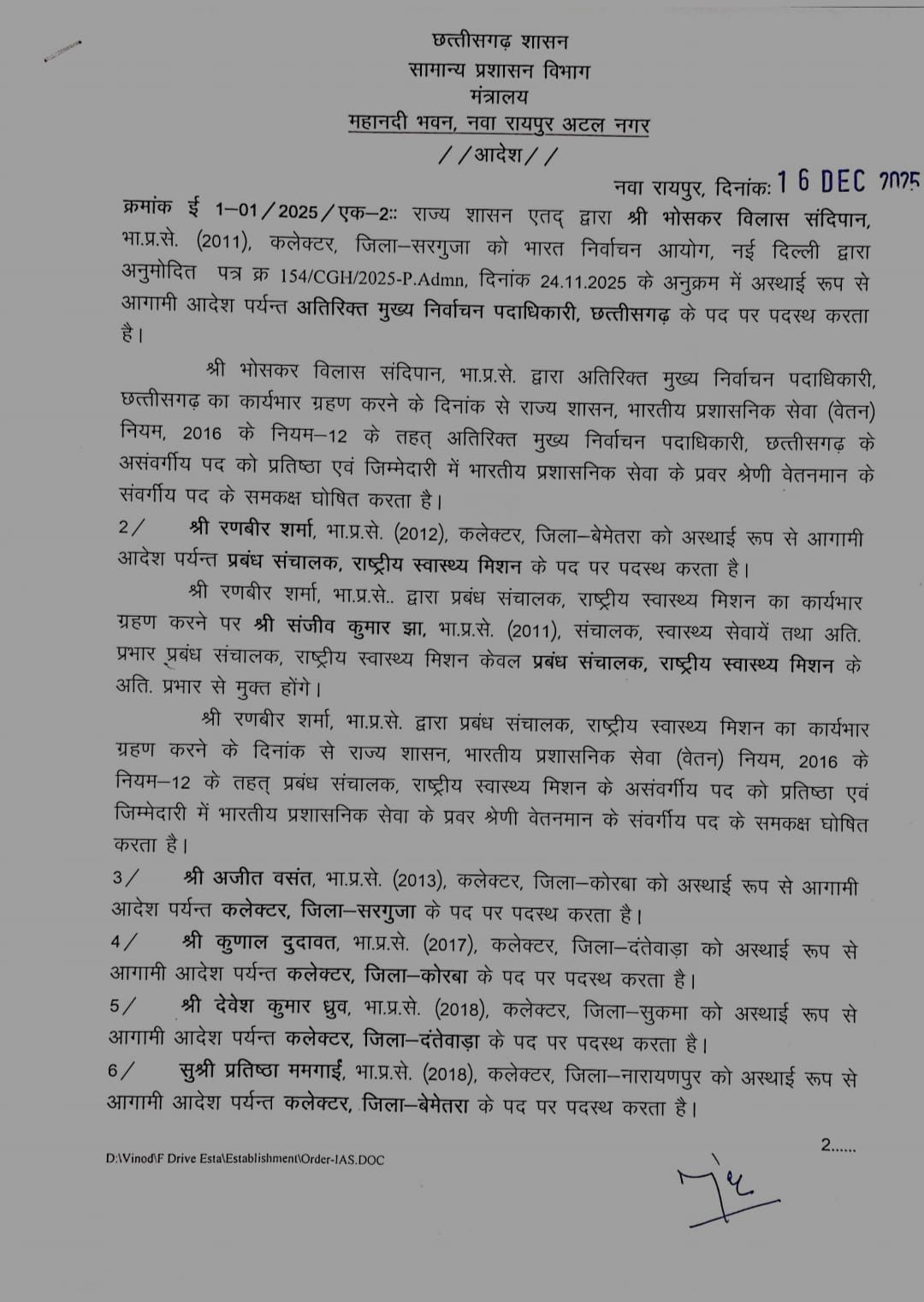 रायपुर – छत्तीसगढ़ में सामान्य प्रशासन विभाग ने बड़ा फेरबदल करते हुए 11 आईएएस अधिकारियों का तबादला किया है, जिनमें कई जिलों के कलेक्टर सहित निगम आयुक्त, जिला पंचायत सीईओ के नाम भी लिस्ट में शामिल है, प्रमुख रूप से कोरबा, सुकमा, नारायणपुर, बेमेतरा, सरगुजा, दंतेवाड़ा के कलेक्टर बदले गए है वही बिलासपुर निगमायुक्त और धमतरी जिला पंचायत सीईओ के नाम शामिल है।