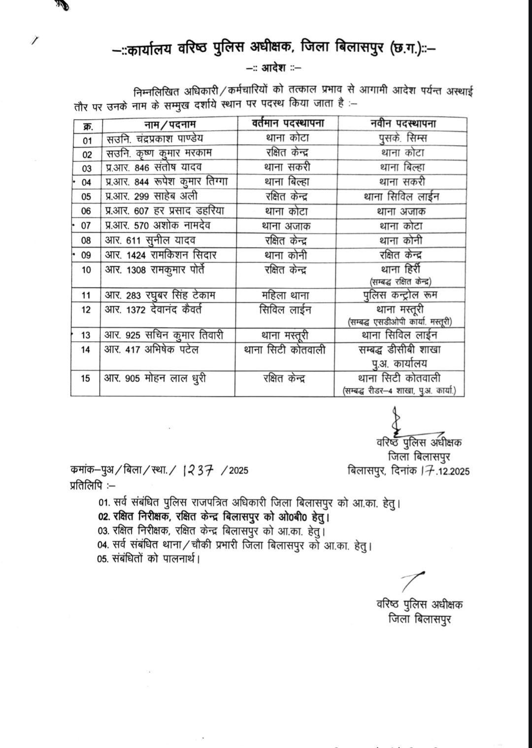 बिलासपुर – एसएसपी रजनेश सिंह ने जिले में फिर कई थाना चौकियों में तैनात पुलिस कर्मियों का तबादला आदेश जारी किया है, जिनमे 15 पुलिस कर्मियों के नाम लिस्ट में शामिल है, लिस्ट में 2 एएसआई 5 हेड कांस्टेबल और 8 कांस्टेबल के नाम शामिल है जिन्हें पुलिस लाईन से थाना और चौकियों में तैनात किया गया है…देखिए आदेश