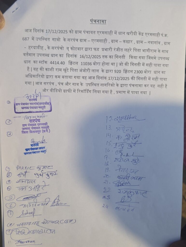 बिलासपुर– जिले के मस्तूरी विकासखंड स्थित एरमसाही धान खरीदी केंद्र में धान की गिनती को लेकर बड़ा विवाद सामने आया है। प्रशासन द्वारा 920 क्विंटल धान की कमी बताए जाने और इसके आधार पर की गई कार्रवाई के बाद किसानों, ग्रामीणों और जनप्रतिनिधियों में भारी आक्रोश देखा गया। विरोध स्वरूप बड़ी संख्या में लोग मौके पर पहुंचे और दोबारा निष्पक्ष गिनती कराए जाने की मांग की।ग्रामीणों और किसानों का कहना है कि 10 दिसंबर को जिला स्तरीय टीम द्वारा की गई धान की गिनती सही तरीके से नहीं की गई।