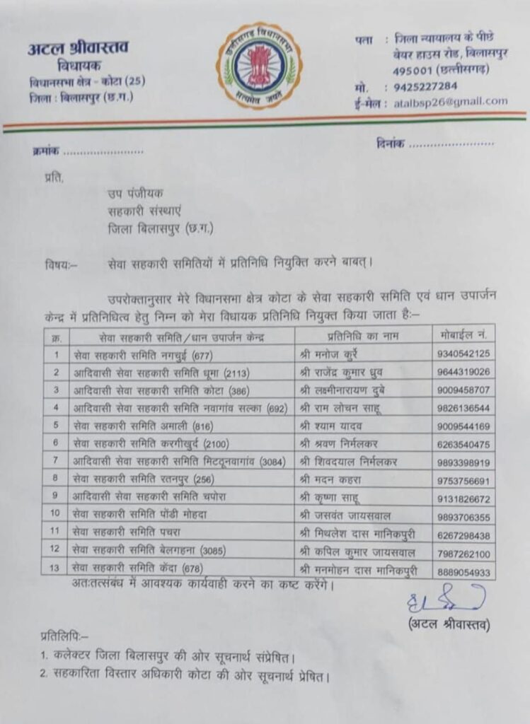 रतनपुर – कोटा विधानसभा क्षेत्र के विधायक अटल श्रीवास्तव द्वारा सोमवार शाम सेवा सहकारी समितियों में विधायक प्रतिनिधियों की सूची जारी की गई। इस सूची में रतनपुर सेवा सहकारी समिति रतनपुर क्रमांक 256 के लिए वरिष्ठ कांग्रेसी नेता मदन कहरा को विधायक प्रतिनिधि नियुक्त किया गया है। उनकी नियुक्ति की खबर मिलते ही क्षेत्र के कांग्रेस कार्यकर्ताओं एवं पदाधिकारियों में उत्साह का माहौल बन गया। नियुक्ति सूची जारी होते ही मदन कहरा को बधाई देने वालों का सिलसिला शुरू हो गया। कांग्रेस नेताओं और कार्यकर्ताओं ने उनके निवास एवं विभिन्न स्थानों पर पहुंचकर शुभकामनाएं दीं और विश्वास जताया कि उनके अनुभव का लाभ किसानों को मिलेगा।