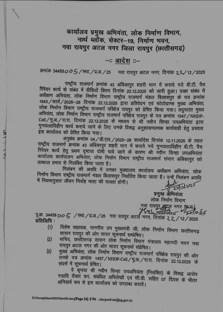 मुख्य अभियंता द्वारा प्रतिवेदन के आधार पर दोषी पाए गए अधिकारी के विरुद्ध अनुशासनात्मक कार्रवाई का प्रस्ताव प्रमुख अभियंता कार्यालय को भेजा गया था। प्रस्ताव पर त्वरित निर्णय लेते हुए लोक निर्माण विभाग ने राष्ट्रीय राजमार्ग संभाग अंबिकापुर के कार्यपालन अभियंता कार्यालय में पदस्थ उप अभियंता नवीन सिन्हा को तत्काल प्रभाव से निलंबित करने का आदेश जारी किया है। निलंबन अवधि के दौरान श्री सिन्हा का मुख्यालय राष्ट्रीय राजमार्ग मंडल, बिलासपुर के अधीक्षण अभियंता कार्यालय में निर्धारित किया गया है। इस अवधि में उन्हें नियमानुसार जीवन निर्वाह भत्ता देय होगा। लोक निर्माण विभाग की इस कार्रवाई को सड़क निर्माण एवं मरम्मत कार्यों में गुणवत्ता सुनिश्चित करने की दिशा में एक सख्त संदेश के रूप में देखा जा रहा है। विभाग ने स्पष्ट किया है कि भविष्य में भी किसी प्रकार की लापरवाही या गुणवत्ताहीन कार्य को बर्दाश्त नहीं किया जाएगा।