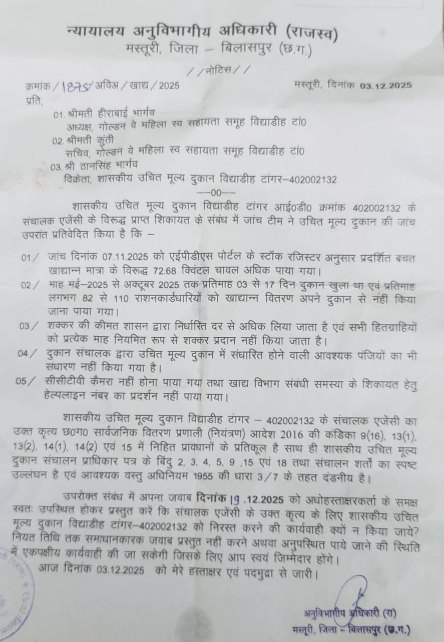 जांच में यह भी पाया गया कि दुकान में सीसीटीवी कैमरा तथा खाद्य विभाग संबंधी शिकायत हेतु हेल्पलाइन नंबर का प्रदर्शन नहीं किया गया था। उक्त कृत्य छत्तीसगढ़ सार्वजनिक वितरण प्रणाली (नियंत्रण) आदेश 2016 की विभिन्न धाराओं तथा आवश्यक वस्तु अधिनियम 1955 के तहत दंडनीय पाए गए हैं। इन तथ्यों के आधार पर न्यायालय अनुविभागीय अधिकारी (राजस्व) मस्तूरी द्वारा 3 दिसंबर 2025 को दुकान की अध्यक्ष, सचिव एवं विक्रेता को नोटिस जारी कर 19 दिसंबर 2025 को व्यक्तिगत रूप से उपस्थित होकर जवाब प्रस्तुत करने के निर्देश दिए गए हैं।