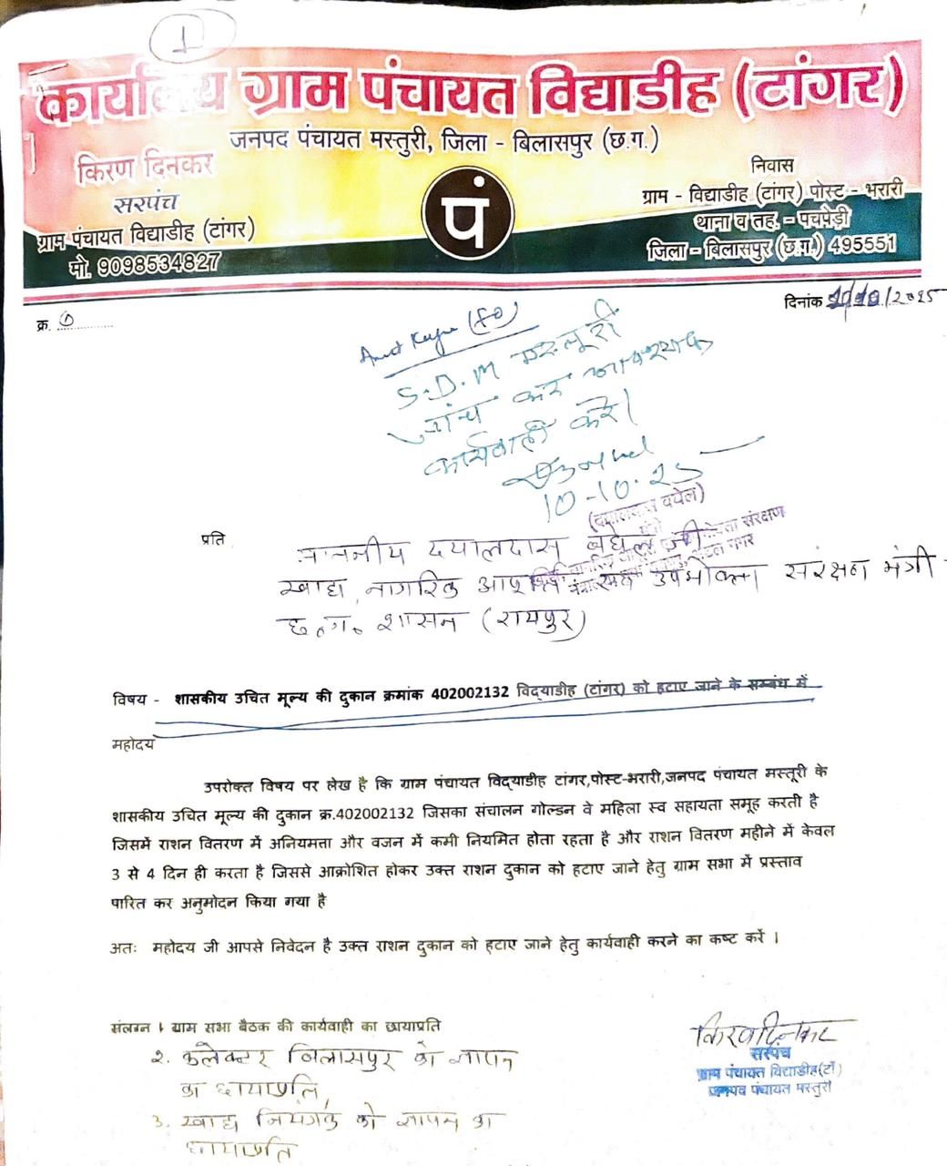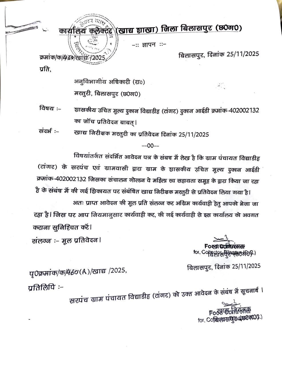 बिलासपुर – मस्तूरी विकासखंड अंतर्गत ग्राम पंचायत विद्याडीह (टांगर) स्थित शासकीय उचित मूल्य दुकान आईडी क्रमांक 402002132 को लेकर गंभीर अनियमितताओं के आरोप सामने आए हैं। ग्राम पंचायत, ग्रामीणों तथा खाद्य विभाग की जांच रिपोर्ट के आधार पर तत्काल कार्रवाई की जरूरत है लेकिन अब तक कोई ठोस कार्रवाई नही हुई है। मामले में खाद्य शाखा बिलासपुर द्वारा अनुविभागीय अधिकारी (राजस्व) मस्तूरी को 25 नवंबर 2025 को भेजे गए पत्र में उल्लेख है कि उक्त दुकान का संचालन गोल्डन वे महिला स्व-सहायता समूह द्वारा किया जा रहा है।