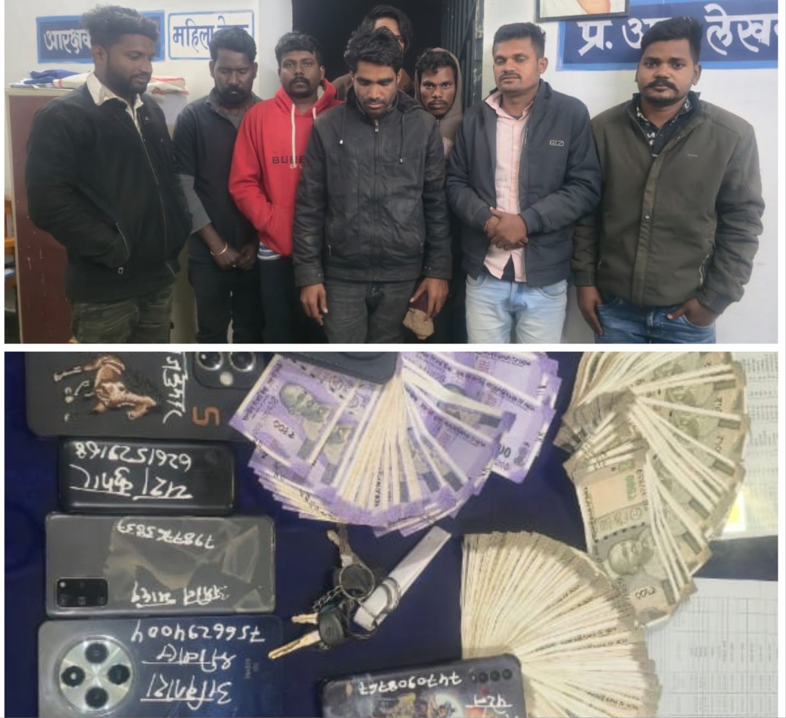बिलासपुर – जिले में संगठित अपराध और अवैध गतिविधियों पर अंकुश लगाने के लिए बिलासपुर पुलिस द्वारा लगातार अभियान चलाया जा रहा है। इसी कड़ी में चौकी बेलगहना थाना कोटा पुलिस ने जंगल में संचालित संगठित जुए के खिलाफ बड़ी कार्रवाई करते हुए 8 आरोपियों को गिरफ्तार किया है। पुलिस ने मौके से नकदी, मोबाइल और मोटरसाइकिल समेत कुल 2 लाख 78 हजार 700 रुपये का मशरूका जब्त किया है।वरिष्ठ पुलिस अधीक्षक रजनेश सिंह के निर्देश तथा अतिरिक्त पुलिस अधीक्षक ग्रामीण डॉ. अर्चना झा और अनुविभागीय पुलिस अधिकारी नुपुर उपाध्याय के मार्गदर्शन में 31 दिसंबर की शाम बेलगहना पुलिस ने बगघरा जंगल में घेराबंदी कर रेड कार्रवाई की। पुलिस को सूचना मिली थी कि घने जंगल के भीतर ताश के पत्तों से काट पत्ती नामक जुआ खेला जा रहा है। रेड के दौरान पुलिस ने मौके से 8 जुआरियों को पकड़ा।