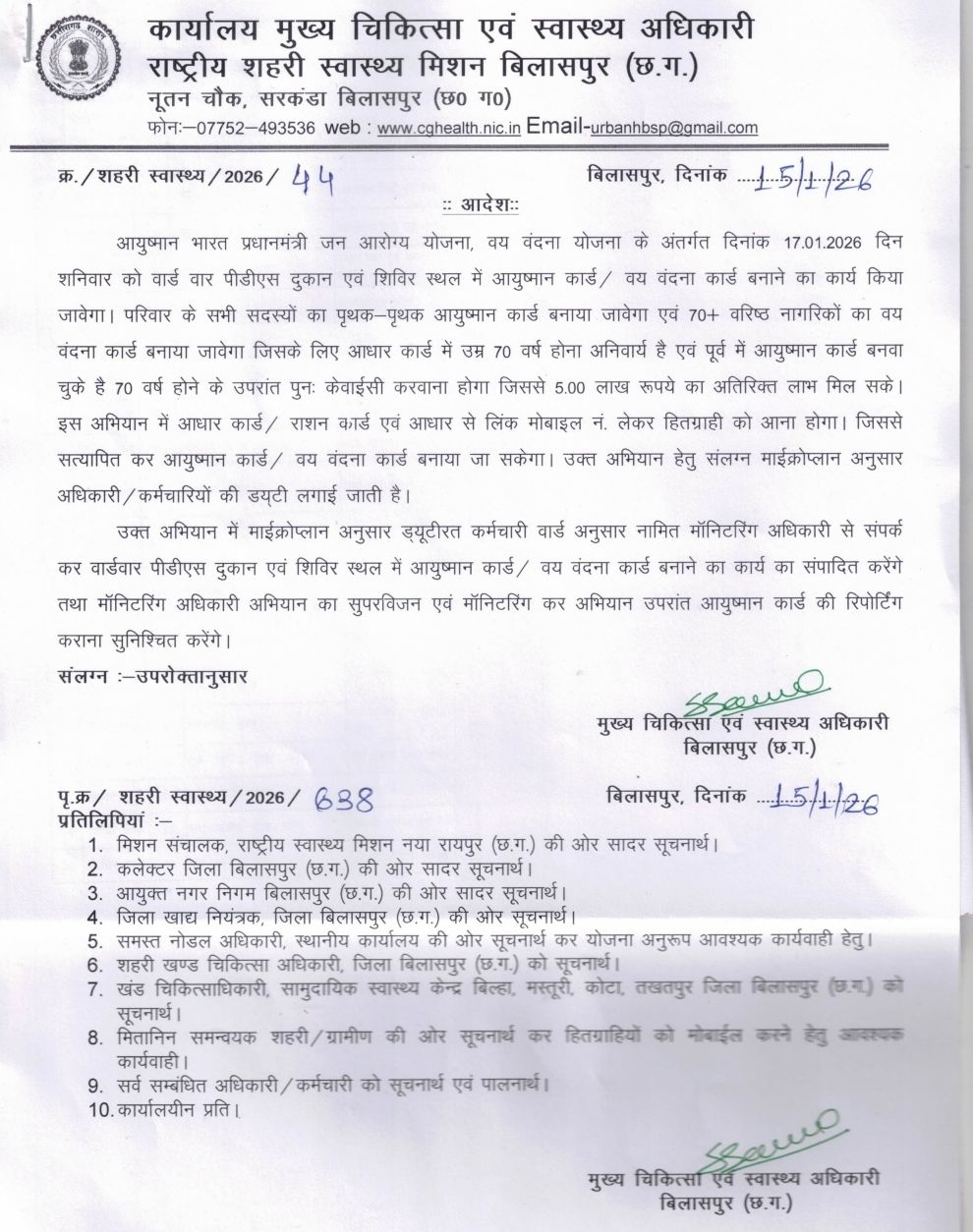 बिलासपुर – राष्ट्रीय शहरी स्वास्थ्य मिशन बिलासपुर के अंतर्गत आयुष्मान भारत प्रधानमंत्री जन आरोग्य योजना एवं वय वंदना योजना के तहत पात्र हितग्राहियों के लिए विशेष अभियान आयोजित किया जा रहा है। मुख्य चिकित्सा एवं स्वास्थ्य अधिकारी, बिलासपुर द्वारा जारी आदेश के अनुसार यह अभियान 17 जनवरी 2026, शनिवार को वार्डवार पीडीएस दुकानों एवं निर्धारित शिविर स्थलों में संचालित किया जाएगा। अभियान के तहत परिवार के सभी पात्र सदस्यों का पृथक-पृथक आयुष्मान कार्ड बनाया जाएगा। वहीं 70 वर्ष या उससे अधिक आयु के वरिष्ठ नागरिकों का वय वंदना कार्ड तैयार किया जाएगा। वय वंदना कार्ड बनवाने के लिए आधार कार्ड में आयु 70 वर्ष या उससे अधिक होना अनिवार्य है। जिन वरिष्ठ नागरिकों का पूर्व में आयुष्मान कार्ड बन चुका है, उन्हें 70 वर्ष पूर्ण होने के उपरांत पुनः ई-केवाईसी कराना होगा, जिससे उन्हें 5 लाख रुपये तक के अतिरिक्त स्वास्थ्य लाभ की पात्रता मिल सकेगी। अभियान में हितग्राहियों को आधार कार्ड, राशन कार्ड तथा आधार से लिंक मोबाइल नंबर के साथ उपस्थित होना आवश्यक होगा, ताकि दस्तावेजों का सत्यापन कर आयुष्मान कार्ड एवं वय वंदना कार्ड निर्गत किया जा सके।