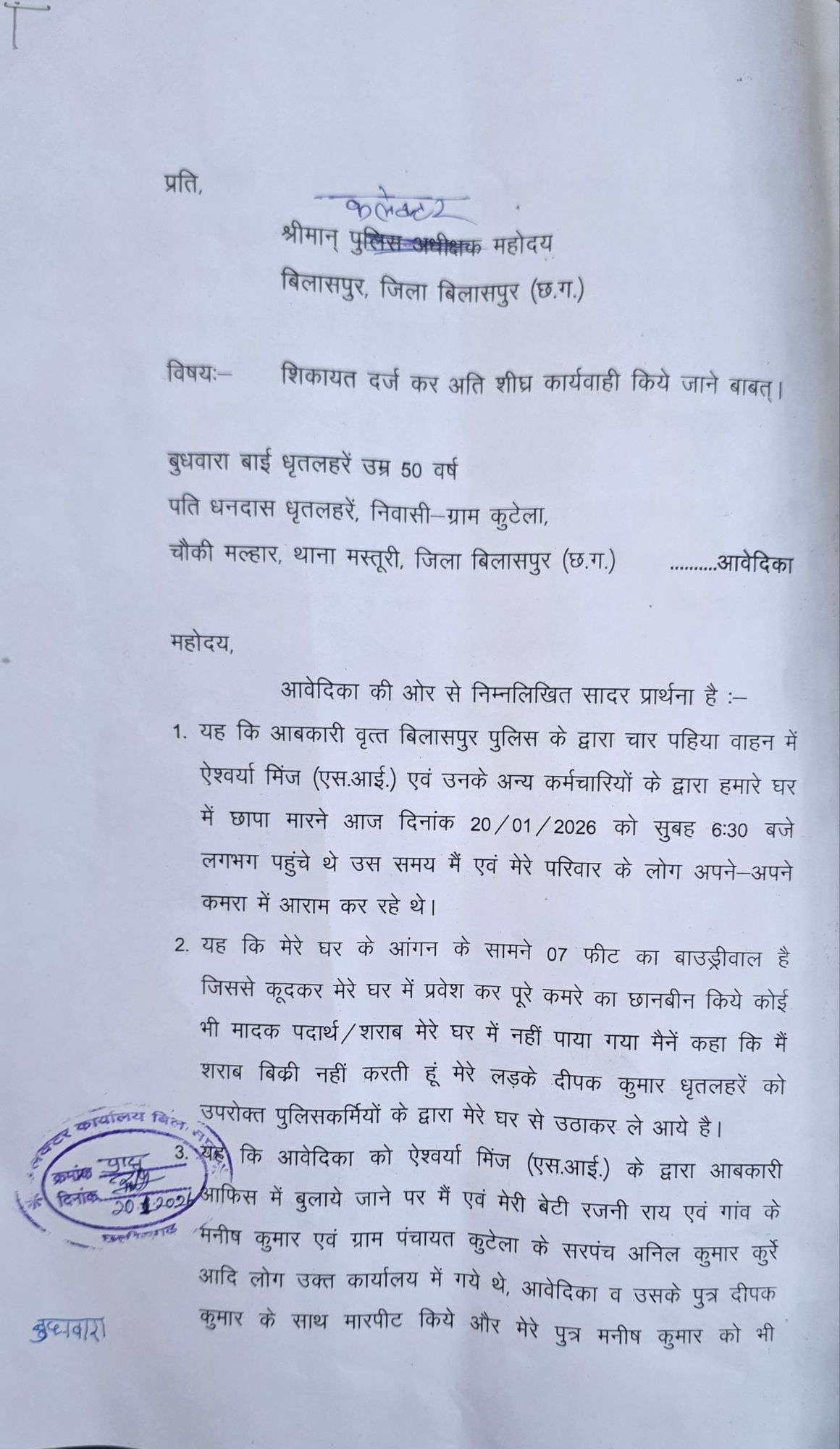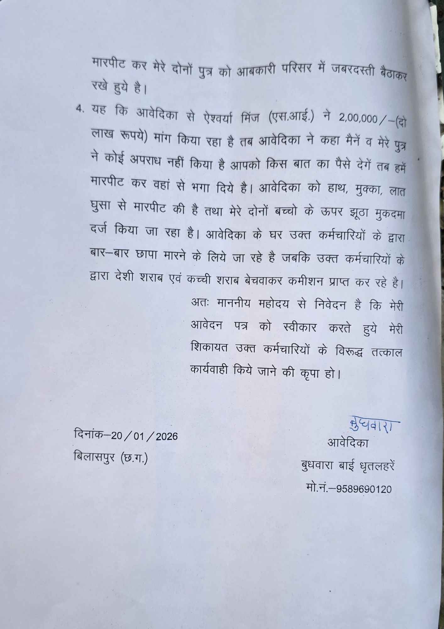 बिलासपुर – जिले के मस्तूरी थाना क्षेत्र के ग्राम कुटेला निवासी एक महिला ने आबकारी विभाग के अधिकारियों पर गंभीर आरोप लगाते हुए कलेक्टर और पुलिस अधीक्षक से लिखित शिकायत की है। पीड़िता बुधवारा बाई धृतलहरें उम्र 50 वर्ष ने आरोप लगाया है कि आबकारी विभाग की एसआई ऐश्वर्या मिंज और उनकी टीम द्वारा उनके घर में अवैध रूप से छापा मारकर न केवल परिवार के सदस्यों के साथ दुर्व्यवहार किया गया, बल्कि उनके एक बेटे को जबरन उठाकर ले जाया गया और झूठे मामले में फंसाने की धमकी दी जा रही है।पीड़िता के अनुसार, 20 जनवरी की सुबह लगभग 6:30 बजे आबकारी वृत्त बिलासपुर की टीम चार पहिया वाहन से उनके घर पहुंची। उस समय परिवार के सभी सदस्य अपने-अपने कमरों में आराम कर रहे थे।