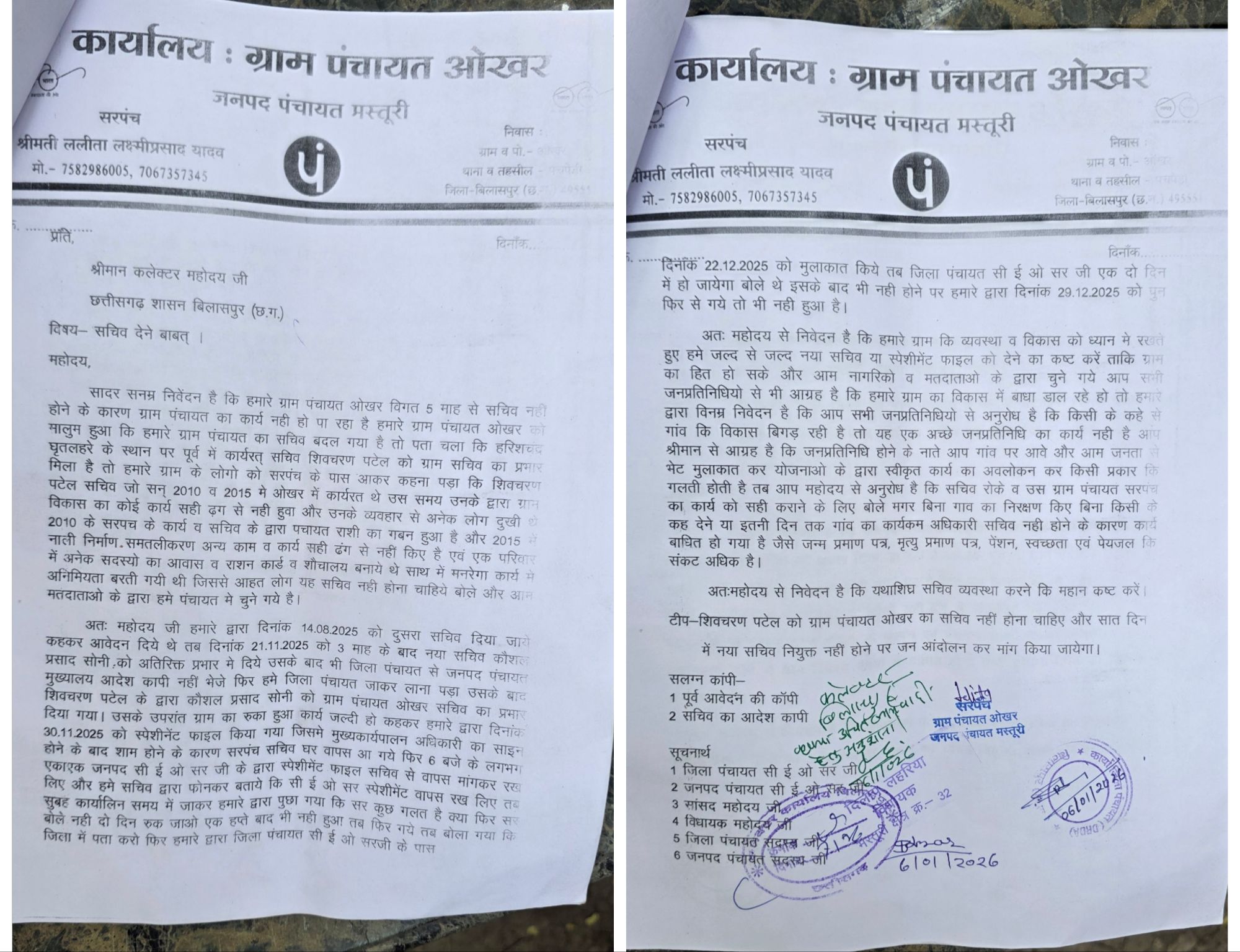 बिलासपुर – जनपद पंचायत मस्तुरी के अंतर्गत आने वाली ग्राम पंचायत ओखर में पिछले कई महीनों से सचिव का पद रिक्त होने के कारण विकास कार्य पूरी तरह ठप हो गए हैं। इस समस्या को लेकर ग्राम पंचायत की सरपंच ललिता लक्ष्मीप्रसाद यादव ने पंचों और जनप्रतिनिधियों के साथ मिलकर बिलासपुर कलेक्टर को ज्ञापन सौंपा है। ग्रामीणों और पंचायत प्रतिनिधियों का कहना है कि 13 अगस्त 2025 से आज 20 जनवरी 2026 तक पंचायत में कोई सचिव नियुक्त नहीं किया गया है। सचिव न होने की वजह से पंचायत के प्रशासनिक कार्य, सरकारी योजनाओं का क्रियान्वयन और ग्रामीणों के जरूरी दस्तावेज संबंधी काम पूरी तरह रुक गए हैं। सरपंच ने बताया कि इस संबंध में पहले भी कई बार आवेदन दिए जा चुके हैं, लेकिन अब तक शासन-प्रशासन की ओर से कोई ठोस कार्रवाई नहीं हुई है। इसी के चलते आज पुनः जनदर्शन के माध्यम से जिला कलेक्टर को अवगत कराया गया है। ज्ञापन में स्पष्ट किया गया है कि सचिव की अनुपस्थिति के कारण गांव में बुनियादी समस्याएं बढ़ती जा रही हैं और विकास की गति शून्य हो गई है। प्रतिनिधियों ने प्रशासन से सवाल किया है कि आखिर किन कारणों से अब तक यहाँ सचिव की नियुक्ति नहीं की जा रही है। अब देखना होगा कि जिला प्रशासन इस गंभीर समस्या का संज्ञान लेकर कब तक ओखर पंचायत को नया सचिव प्रदान करता है, ताकि ग्रामीणों की समस्याओं का निराकरण हो सके।