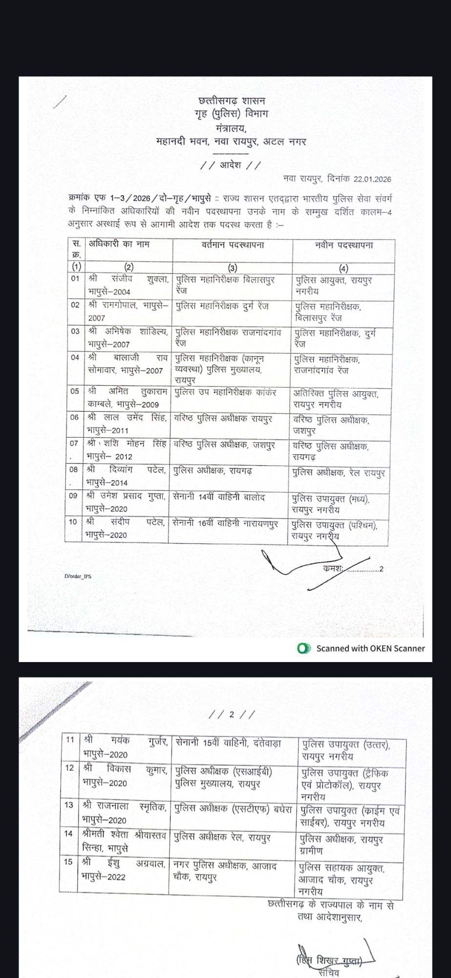 शशिमोहन सिंह वरिष्ठ पुलिस अधीक्षक रायगढ़, दिव्यांग पटेल पुलिस अधीक्षक रेल रायपुर, उमेश प्रसाद गुप्ता पुलिस उपायुक्त मध्य रायपुर नगरीय, संदीप पटेल पुलिस उपायुक्त पश्चिम रायपुर नगरीय, मयंक गुर्जर पुलिस उपायुक्त उत्तर रायपुर नगरीय, विकास कुमार उपायुक्त ट्रैफिक एवं प्रोटोकॉल, राजनाला स्मृतिक पुलिस उपायुक्त क्राइम एवं सायबर, श्वेता श्रीवास्तव पुलिस अधीक्षक रायपुर ग्रामीण, ईशु अग्रवाल पुलिस सहायक आयुक्त आजाद चौक रायपुर नगरीय शामिल है।