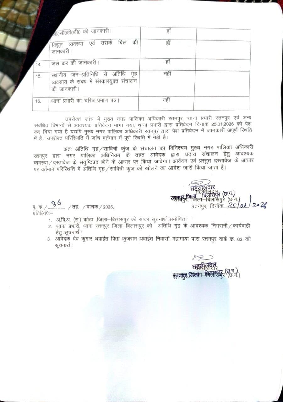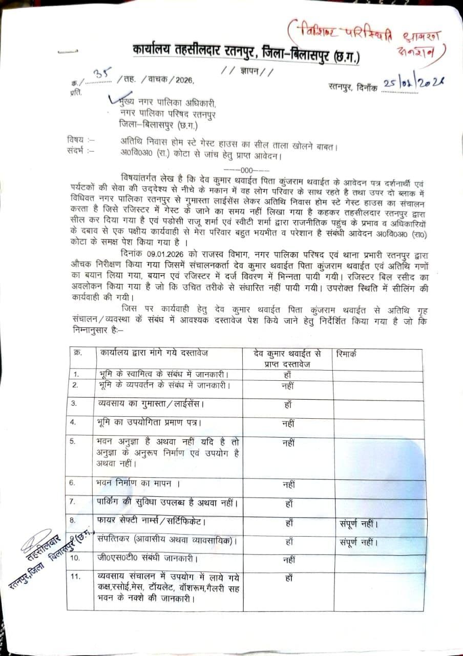 रतनपुर – नगर में प्रशासनिक कार्यप्रणाली पर सवाल खड़े करने वाला मामला सामने आया है, जहां आमरण अनशन के बाद तहसील प्रशासन को राम दरबार अतिथि निवास (होम स्टे) की सील हटाने का आदेश जारी करना पड़ा। मामला 9 जनवरी का है, जब तहसीलदार शिल्पा भगत के निर्देश पर नगरपालिका और थाना स्टाफ की संयुक्त टीम ने राम दरबार अतिथि निवास में औचक निरीक्षण किया था।