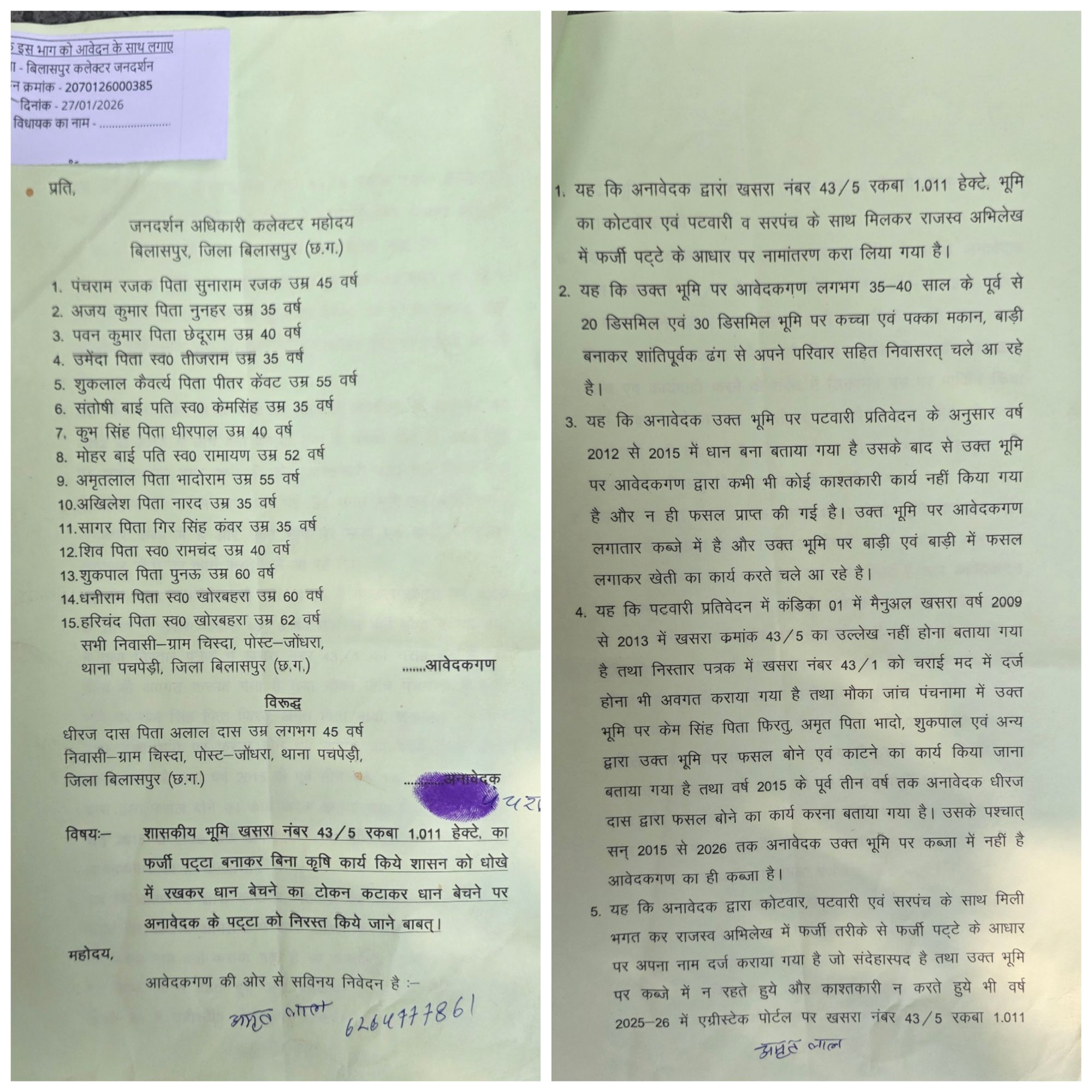 बिलासपुर – जिले के पचपेड़ी तहसील अंतर्गत ग्राम चिस्दा में शासकीय भूमि पर फर्जी पट्टा बनाकर अवैध नामांतरण और बिना कृषि कार्य किए धान बिक्री टोकन कटवाने का गंभीर मामला सामने आया है। मामले में उक्त जमीन पर काबिज पीड़ित परिवारों ने कलेक्टर जनदर्शन में शिकायत दर्ज कराते हुए आरोप लगाया है कि खसरा नंबर 43/5, रकबा 1.011 हेक्टेयर शासकीय भूमि पर गांव का ही एक व्यक्ति द्वारा कोटवार, पटवारी एवं सरपंच से मिलीभगत कर फर्जी दस्तावेजों के आधार पर राजस्व अभिलेखों में नाम दर्ज कराया गया। शिकायत के अनुसार, उक्त भूमि पर पीड़ित परिवारों के द्वारा पिछले 35–40 वर्षों से शांतिपूर्वक काबिज होकर निवासरत हैं तथा खेती-बाड़ी करते आ रहे हैं। पटवारी प्रतिवेदन में वर्ष 2012 से 2015 तक धान बोना दर्शाया गया, जबकि उसके बाद कोई कृषि कार्य नहीं किया गया। बावजूद इसके, वर्ष 2025–26 में किसान कोड के माध्यम से धान बिक्री का टोकन कटवाया गया, जिसे शासन के साथ धोखाधड़ी बताया गया है।