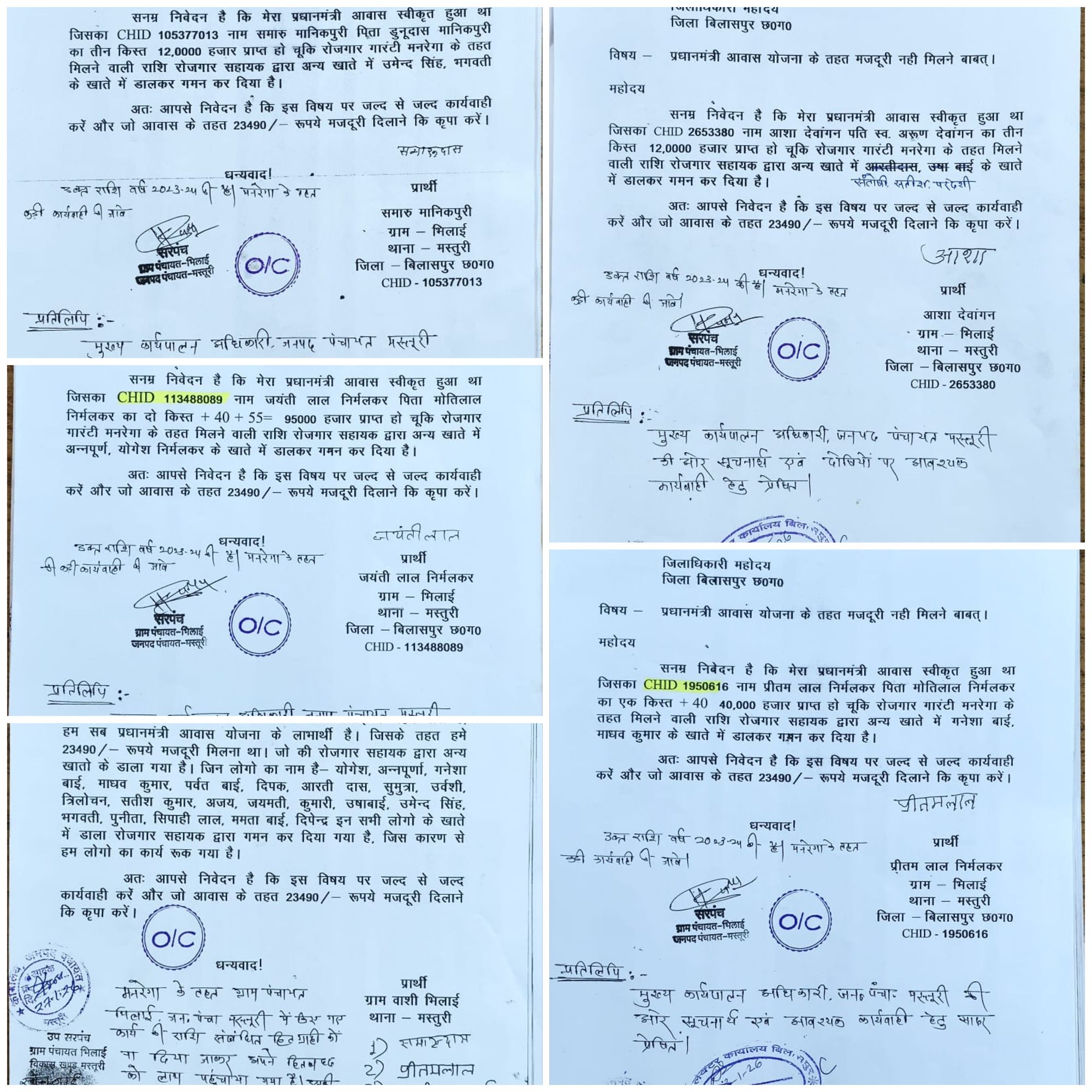 बिलासपुर – जिले के मस्तूरी विकासखंड अंतर्गत ग्राम पंचायत भिलाई में मनरेगा मजदूरी भुगतान को लेकर सामने आए कथित भ्रष्टाचार के मामले ने तूल पकड़ लिया है। प्रधानमंत्री आवास योजना ग्रामीण के तहत स्वीकृत आवासों से जुड़े हितग्राहियों ने 27 जनवरी, मंगलवार को एक बार फिर जनपद पंचायत मस्तूरी पहुंचकर लिखित शिकायत दर्ज कराई और निष्पक्ष जांच व त्वरित कार्रवाई की मांग की है। ग्रामीणों का आरोप है कि योजना के अंतर्गत किए गए श्रम की मजदूरी राशि वास्तविक हितग्राहियों को न देकर गांव के अन्य व्यक्तियों के बैंक खातों में ट्रांसफर कर दी गई। शिकायत के अनुसार ग्राम भिलाई में समारू मानिकपुरी, जयन्ती लाल निर्मलकर, आशा देवांगन, प्रीतम लाल निर्मलकर सहित कई हितग्राहियों के प्रधानमंत्री आवास स्वीकृत हुए थे। आवास निर्माण की विभिन्न किस्तों की राशि तो जारी हुई, लेकिन मनरेगा के तहत मिलने वाली मजदूरी की रकम आज तक हितग्राहियों को नहीं मिली। पीड़ितों ने बताया कि प्रत्येक हितग्राही को लगभग 23,490 रुपये मजदूरी मिलनी थी, जिसे रोजगार सहायक द्वारा कथित रूप से अन्य लोगों के खातों में डलवाया गया। आरोप है कि यह राशि योगेश, अन्नपूर्णा, गणेश बाई, माधव कुमार, भगवती सहित अन्य व्यक्तियों के खातों में भेजी गई, जिनका संबंधित आवास निर्माण से कोई संबंध नहीं है।