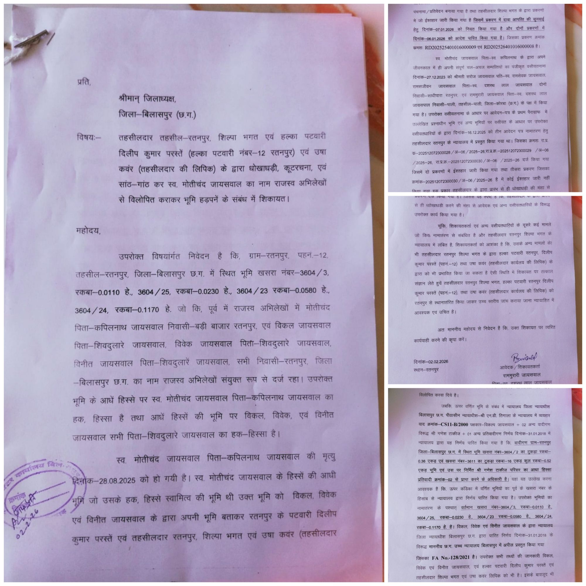 बिलासपुर – रतनपुर तहसील क्षेत्र में भूमि नामांतरण और राजस्व अभिलेखों में कथित धोखाधड़ी का गंभीर मामला सामने आया है। इस संबंध में ग्राम पाली जिला कोरबा निवासी शिकायतकर्ता राममुरारी जायसवाल ने कलेक्टर बिलासपुर को लिखित शिकायत सौंपकर तहसील रतनपुर के अधिकारियों एवं कर्मचारियों पर मिलीभगत कर अनियमित कार्यवाही करने का आरोप लगाया है। शिकायत के अनुसार ग्राम रतनपुर, पटवारी हल्का क्रमांक-12 अंतर्गत खसरा नंबर 3604/3, 3604/25, 3604/23 एवं 3604/24 की भूमि पूर्व में संयुक्त रूप से राजस्व अभिलेखों में दर्ज थी। इसमें स्वर्गीय मोतीचंद जायसवाल एवं अन्य सह-खातेदारों का विधिवत नाम दर्ज था। आरोप है कि स्व. मोतीचंद जायसवाल के निधन के बाद, जबकि उनके वैध वारिसों से संबंधित न्यायिक प्रक्रियाएं लंबित थीं, इसके बावजूद तहसील कार्यालय रतनपुर में पदस्थ अधिकारियों और हल्का पटवारी द्वारा नियमों को दरकिनार कर नामांतरण कर दिया गया।