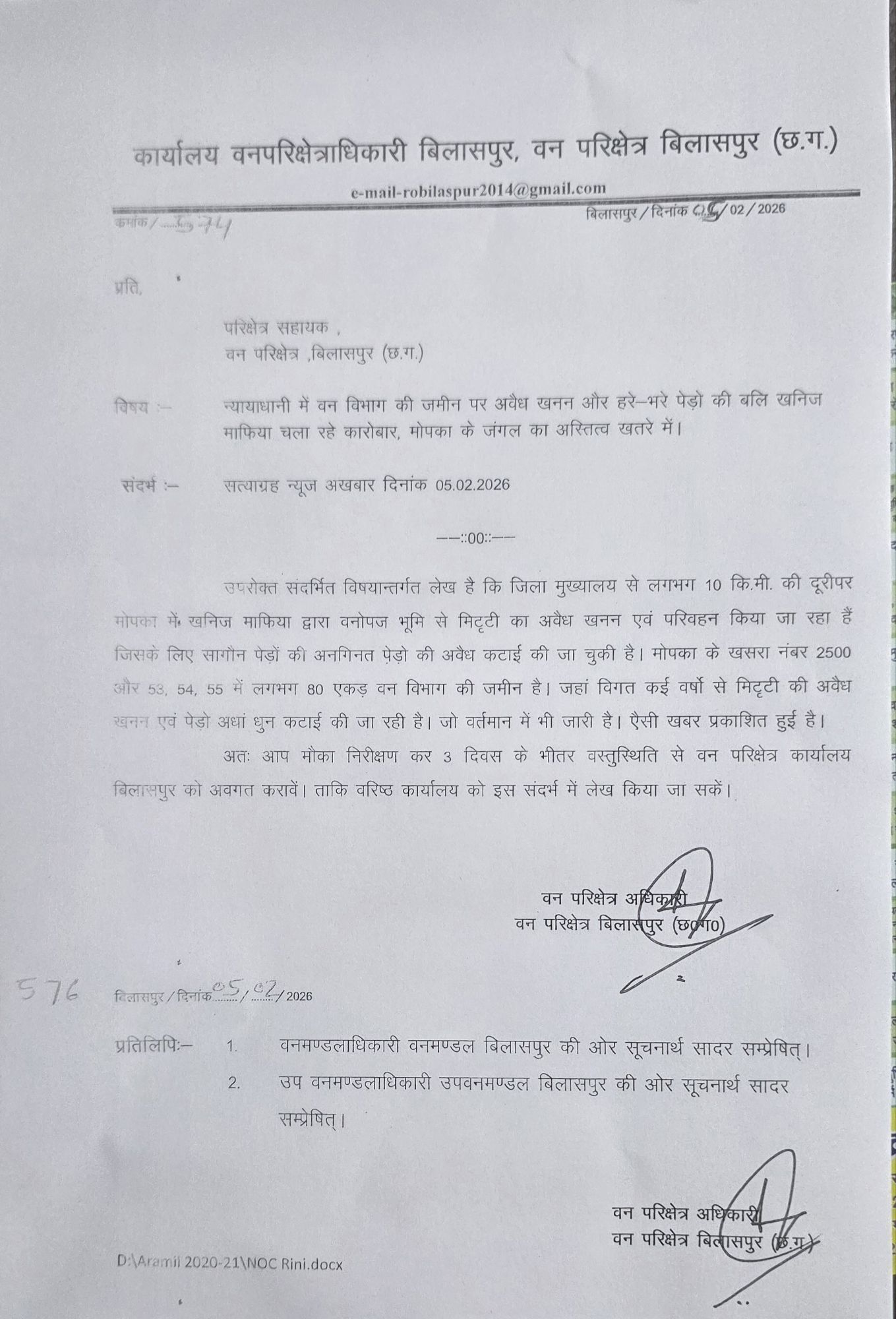 बिलासपुर – एक बार फिर सत्याग्रह न्यूज के खबर का असर हुआ है। जहाँ बिलासपुर वन मंडल के अंतर्गत आने वाले मोपका के जंगल में हो रहे अवैध खनन और अंधाधुन पेड़ो की कटाई के मामले में वन विभाग द्वारा जांच शुरू कर दी गई है। आपको बता दे कि जिला प्रशासन के नाक के नीचे हो रहे हरे भरे जंगल के दोहन के मामले में सत्याग्रह न्यूज की टीम ने मौके पर पहुंच वास्तविक स्थिति को प्रमुखता से न्यूज के माध्यम प्रसारित किया था। जिसके चंद घंटों में ही खबर पर मुहर लगाते हुए रेंजर ने परिक्षेत्र सहायक अधिकारी को जांच के आदेश जारी किए है। जिसमे तीन दिनों के भीतर उक्त मामले की जांच कर रिपोर्ट देने कहा गया है। आपको बता दे कि न्यायधानी में मोपका के खसरा नं 2500, और 53,54,55 में 80 एकड़ के आसपास की वन विभाग की जमीन है। जहा बीते कई वर्षो से अवैध मिट्टी का खनन और पेड़ों की अंधा धुन कटाई की गई है।