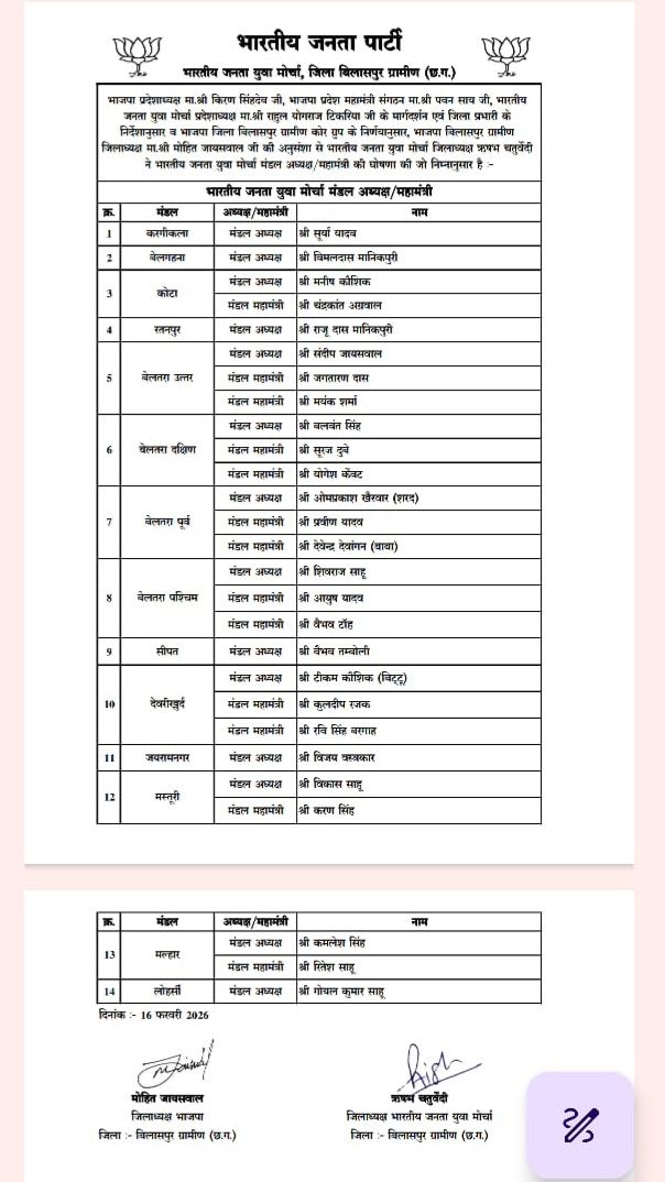मल्हार – भारतीय जनता पार्टी के संगठनात्मक विस्तार के तहत मल्हार मंडल में युवा नेतृत्व को नई जिम्मेदारी दी गई है। मल्हार मंडल भाजपा युवा मोर्चा के अध्यक्ष पद पर कमलेश सिंह की नियुक्ति की गई है। उनकी नियुक्ति से कार्यकर्ताओं में उत्साह का माहौल है। कमलेश सिंह वर्तमान में मल्हार नगर के वार्ड क्रमांक 5 के पार्षद भी हैं और लंबे समय से संगठन में सक्रिय भूमिका निभाते आ रहे हैं।