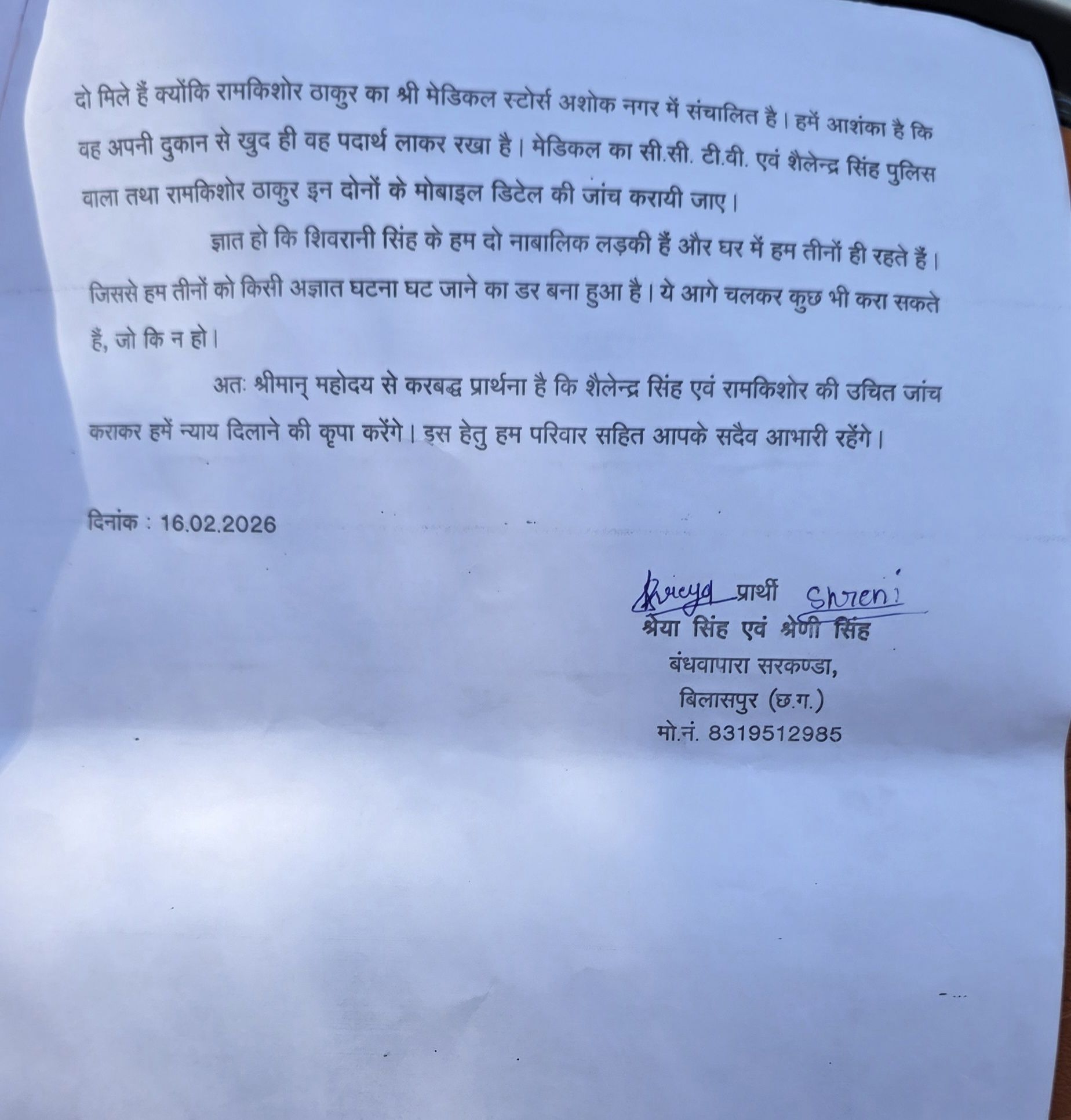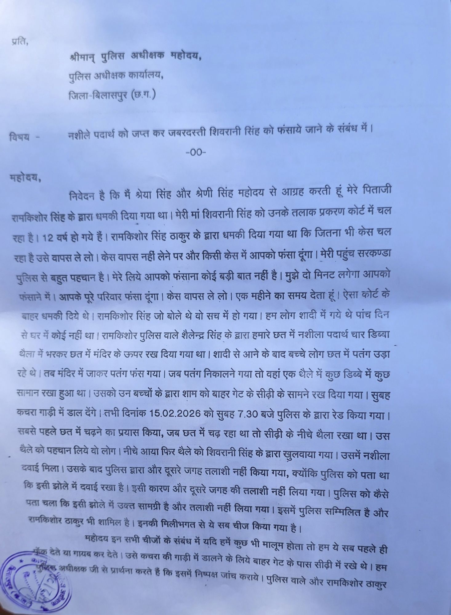 बिलासपुर – शहर के सरकंडा थाना क्षेत्र में पुलिस की एक कार्रवाई को लेकर गंभीर सवाल खड़े हो गए हैं। एक महिला के खिलाफ एनडीपीएस एक्ट के तहत की गई कार्रवाई को साज़िशपूर्ण बताते हुए उसकी दो नाबालिग बेटियों और पड़ोसियों ने पुलिस अधीक्षक से निष्पक्ष जांच की मांग की है। बेटियों ने पड़ोसियों की मदद से शिकायत देकर न्याय की गुहार लगाई है। शिकायत में बताया गया है कि उनकी मां शिवरानी सिंह के खिलाफ 15 फरवरी 2026 को पुलिस ने रेड कार्रवाई करते हुए नशीला पदार्थ बरामद दिखाया और मामला दर्ज किया। हालांकि बेटियों का आरोप है कि यह पूरा मामला पूर्व विवाद के चलते रचा गया षड्यंत्र है और इसमें उनके पिता जो उन लोगों से अलग रहते है और पुलिस कर्मी की मिलीभगत बताई गई है।