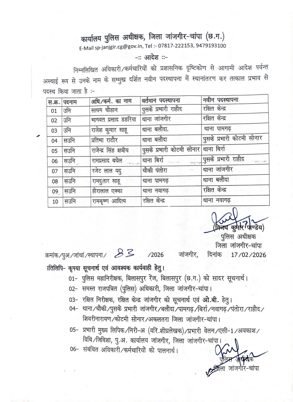 जांजगीर चाम्पा- एसपी ने जिले के विभिन्न थाना और चौकियों में पदस्थ एसआई और एएसआई 10 पुलिस कर्मियों का तबादला आदेश जारी किया है, जिन्हें इधर से उधर किया गया है, कई पुलिस कर्मियों को पुलिस लाईन भेजा गया था कई को चौकियों में प्रमुखता से तैनाती दी गई है।