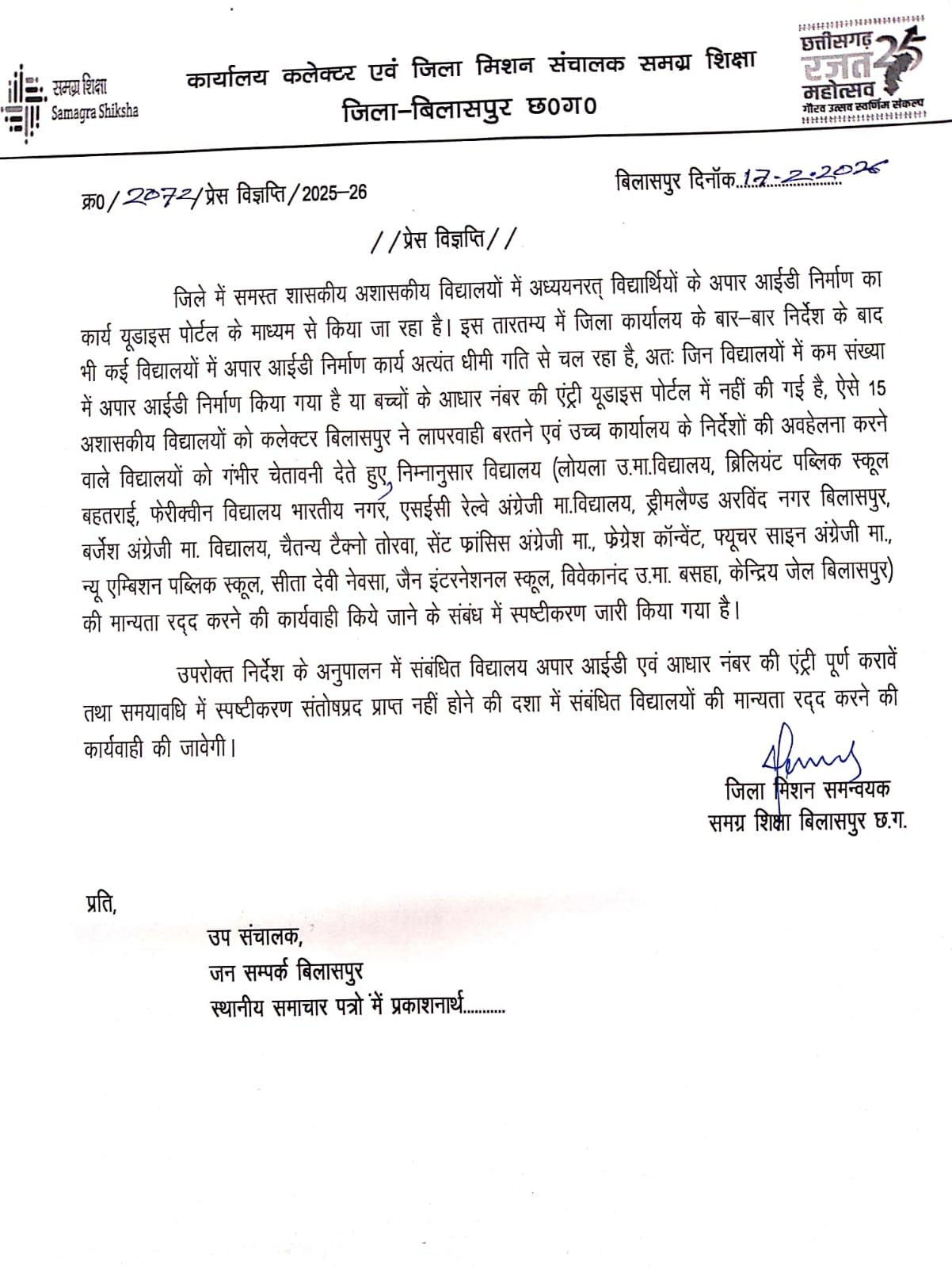 बिलासपुर – जिले में अपार आईडी (APAAR ID) निर्माण में लापरवाही बरतने वाले 15 अशासकीय स्कूलों पर मान्यता रद्द होने का खतरा मंडरा रहा है। कलेक्टर एवं जिला मिशन संचालक, समग्र शिक्षा कार्यालय की ओर से जारी आदेश में बताया गया है कि जिले के सभी शासकीय और अशासकीय विद्यालयों में अध्ययनरत विद्यार्थियों की अपार आईडी का निर्माण यू-डायस पोर्टल के माध्यम से अनिवार्य रूप से किया जा रहा है। जिला कार्यालय द्वारा बार-बार निर्देश जारी करने के बावजूद कई निजी स्कूलों में यह कार्य अत्यंत धीमी गति से चल रहा है। कुछ विद्यालयों में विद्यार्थियों की अपार आईडी संख्या बहुत कम बनाई गई है, जबकि कई बच्चों के आधार नंबर की प्रविष्टि भी पोर्टल में नहीं की गई है।
