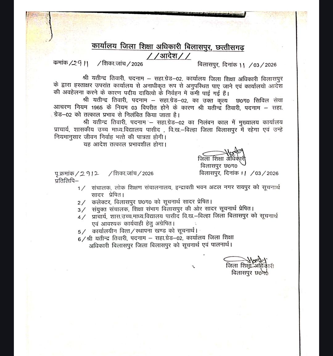 जिसमे पहले आरटीई और उसके बाद न्यायालयीन कार्य की जिम्मेदारी दी गई थी। लेकिन यतीन्द्र तिवारी द्वारा दोनो ही जिम्मेदारी को लेने से साफ इंकार कर दिया गया। सूत्रों की माने तो इसको लेकर डीईओ द्वारा सहायक ग्रेड 2 यतीन्द्र तिवारी को स्पष्टीकरण मांगा गया था। जिसके द्वारा कोई भी जवाब वर्तमान दिनाक तक नहीं दिए जाने के परिपेक्ष में छत्तीसगढ़ सिविल सेवा आचरण 1965 के नियम 3 के तहत प्रभाव से निलंबित कर बिल्हा ब्लॉक के शासकीय उच्चतर माध्यमिक शाला पासीद में तय किया गया है।