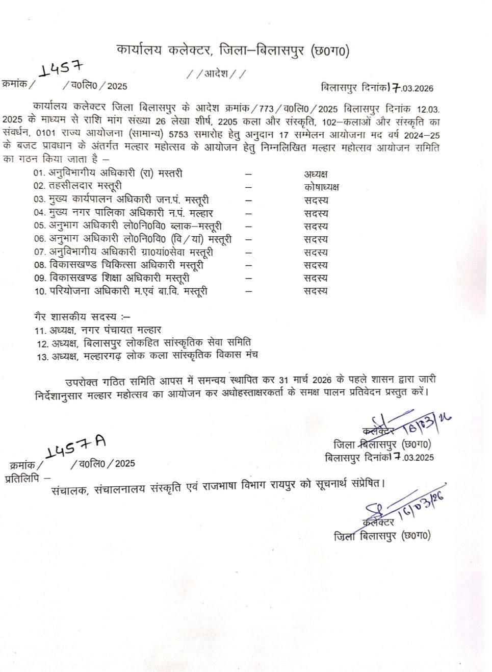 आयोजन के लिए बनाई गई समिति में मस्तूरी एसडीएम को अध्यक्ष, तहसीलदार मस्तूरी को कोषाध्यक्ष बनाया गया है। इसके अलावा मुख्य कार्यपालन अधिकारी, मुख्य नगर पंचायत अधिकारी, लोक निर्माण विभाग, ग्रामीण यांत्रिकी सेवा, स्वास्थ्य, शिक्षा एवं महिला एवं बाल विकास विभाग के अधिकारी सदस्य के रूप में शामिल किए गए हैं। साथ ही तीन गैर-शासकीय सदस्यों को भी जोड़ा गया है, जिनमें नगर पंचायत मल्हार के अध्यक्ष, बिलासपुर लोकहित सांस्कृतिक सेवा समिति के अध्यक्ष और मल्हारगढ़ लोक कला सांस्कृतिक विकास मंच के अध्यक्ष शामिल हैं।प्रशासनिक और गैर-शासकीय सदस्यों के बीच समन्वय स्थापित कर महोत्सव को सफल बनाने की तैयारी की जा रही है।