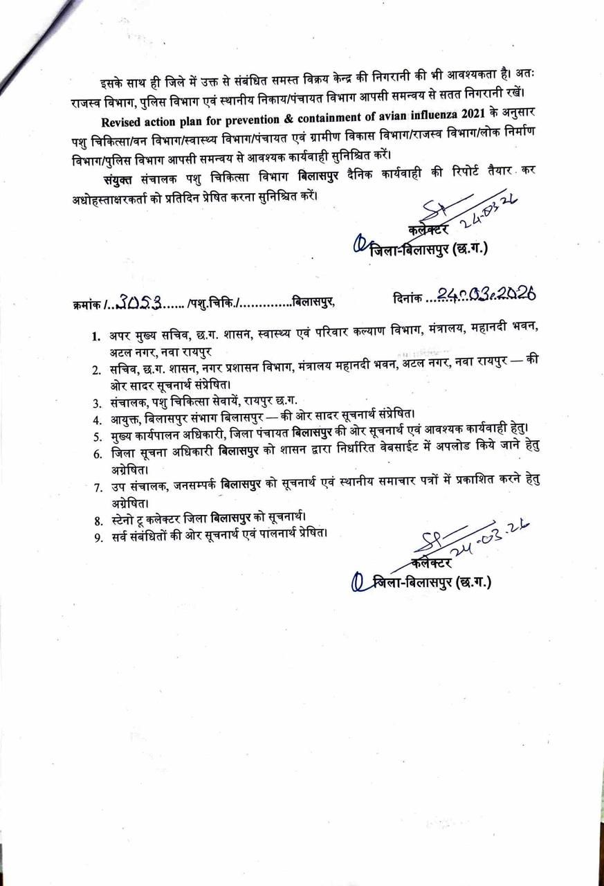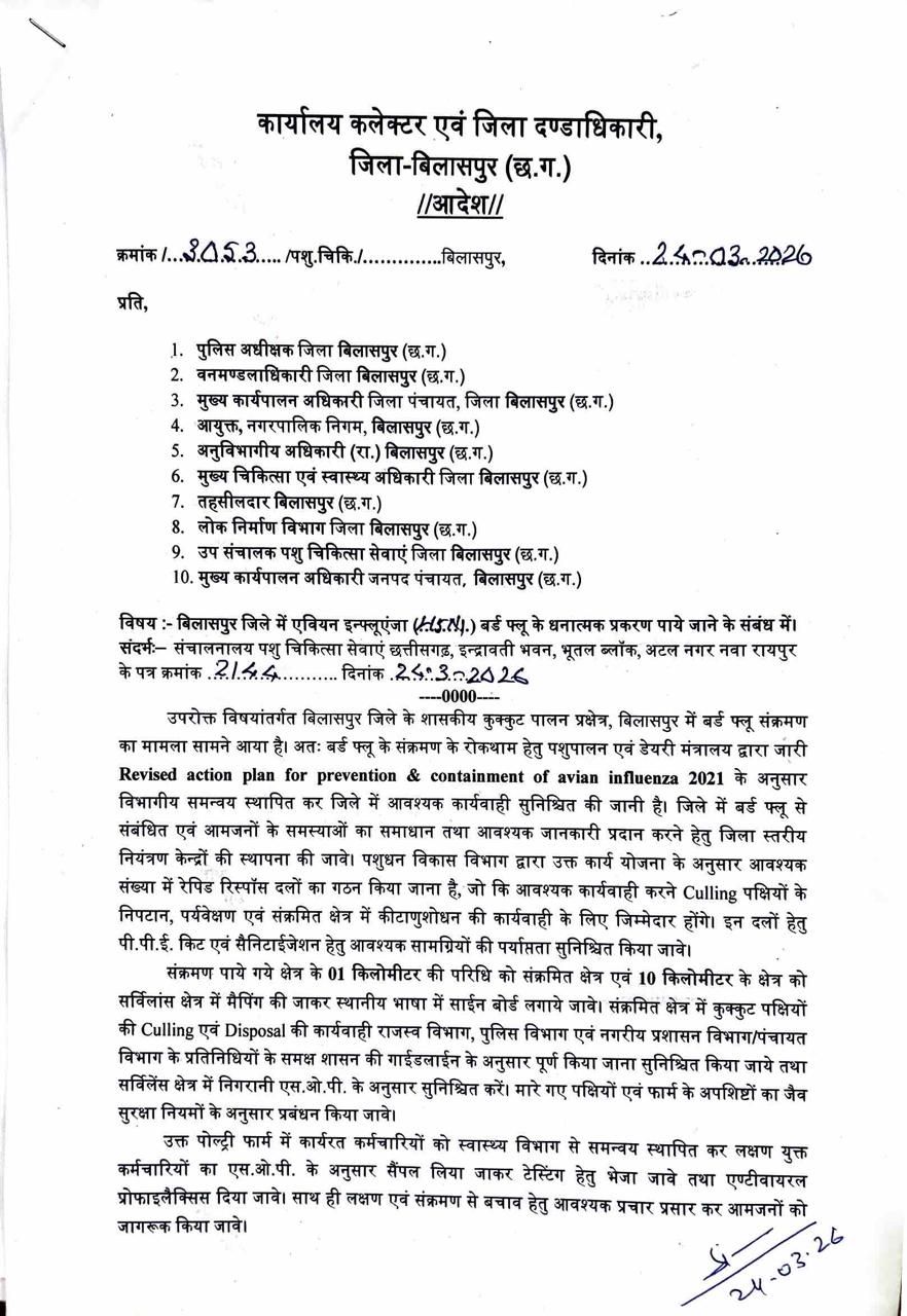 बिलासपुर – जिले में बर्ड फ्लू (एवियन इन्फ्लुएंजा) के एक मामले की पुष्टि होने के बाद कलेक्टर एवं जिला दंडाधिकारी संजय अग्रवाल ने तत्काल प्रभाव से व्यापक नियंत्रण एवं रोकथाम के निर्देश जारी किए हैं। शासकीय कुक्कुट पालन प्रक्षेत्र कोनी में संक्रमण पाए जाने के बाद प्रशासन अलर्ट मोड में आ गया है। कलेक्टर ने पशुपालन एवं डेयरी विभाग द्वारा जारी रिवाइज्ड एक्शन प्लान फॉर प्रिवेंशन एंड कॉन्टेनमेंट ऑफ एवियन इन्फ्लूएंजा 2021 के तहत आदेश जारी कर सभी आवश्यक कार्यवाही सुनिश्चित करने के निर्देश दिए हैं।