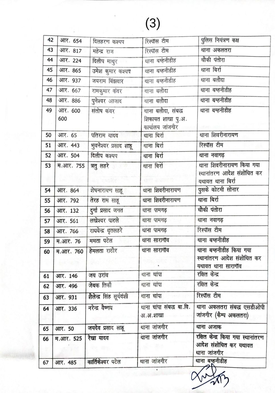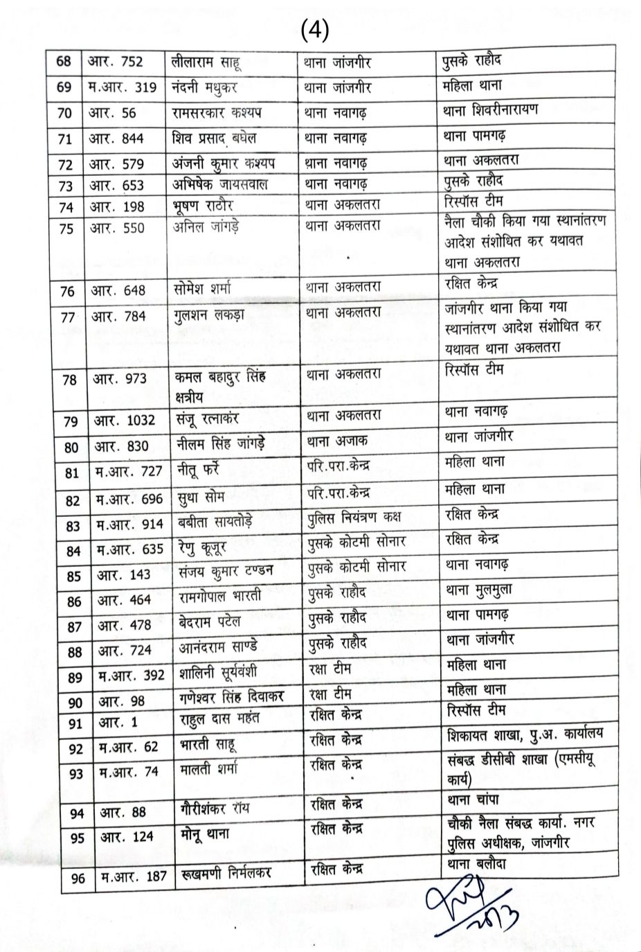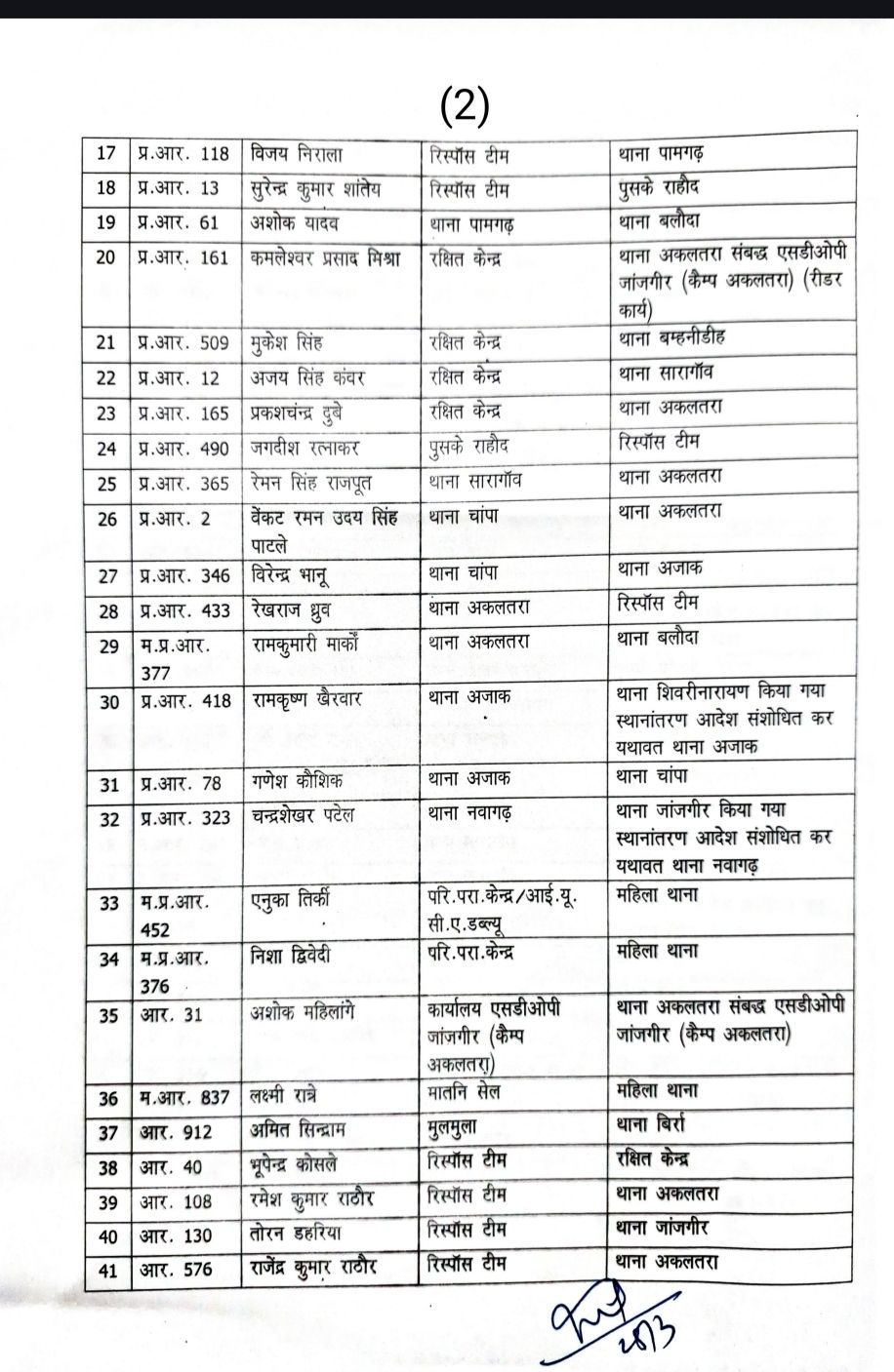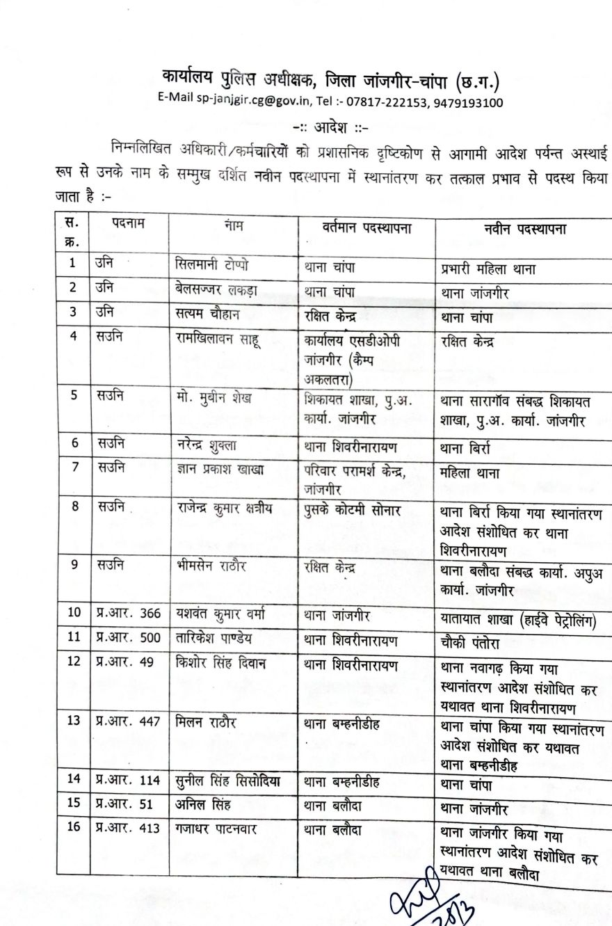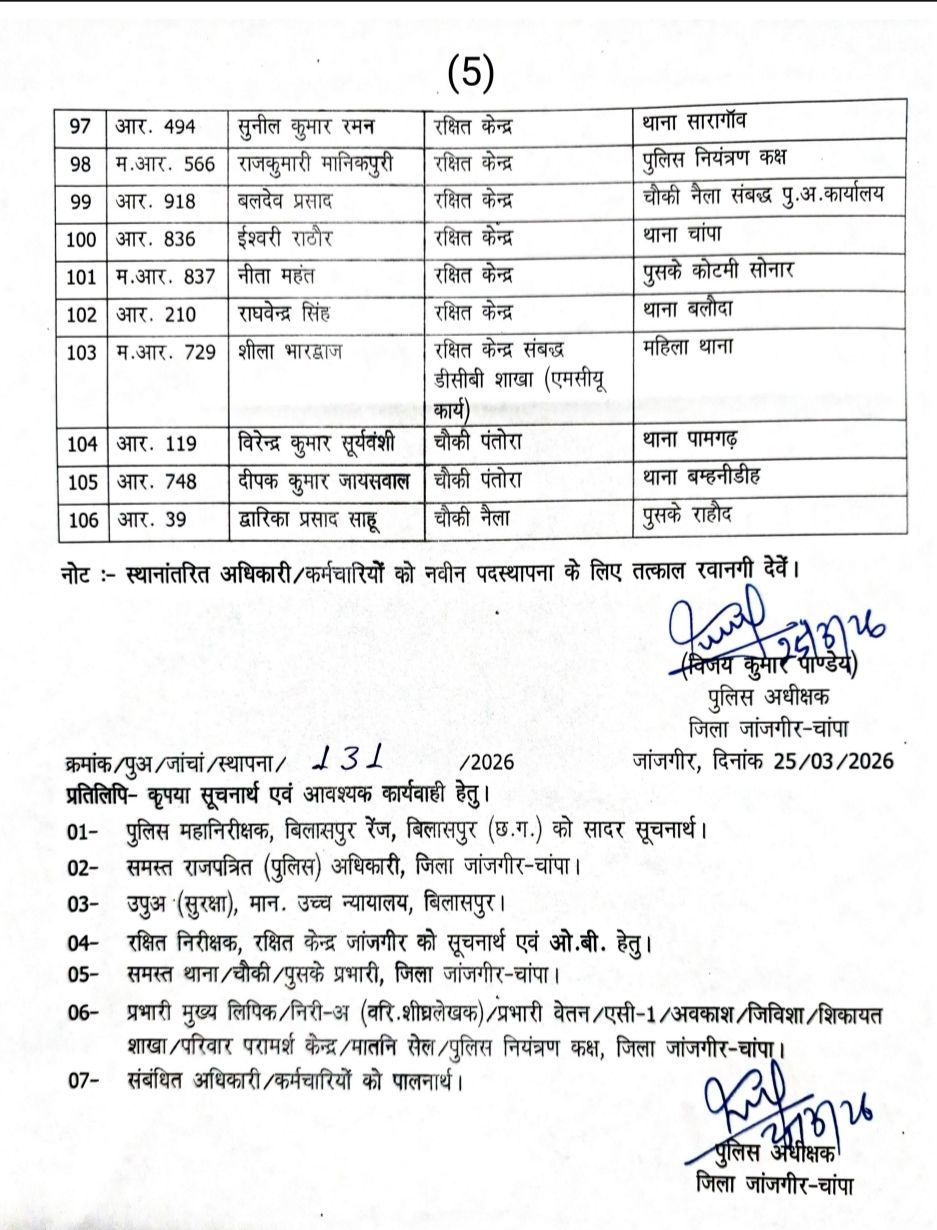 जांजगीर-चांपा – जिले की कानून-व्यवस्था को और अधिक मजबूत, प्रभावी और जवाबदेह बनाने के उद्देश्य से पुलिस विभाग में बड़ा प्रशासनिक फेरबदल किया गया है। पुलिस अधीक्षक विजय कुमार पाण्डेय ने व्यापक स्तर पर तबादला आदेश जारी करते हुए जिले के 106 पुलिस अधिकारी और कर्मचारियों को एक स्थान से दूसरे स्थान पर पदस्थ किया है। इस कार्रवाई को जिले के पुलिस महकमे में लंबे समय बाद हुए बड़े बदलाव के रूप में देखा जा रहा है। जारी आदेश के अनुसार, ऐसे अधिकारी-कर्मचारियों को प्राथमिकता से स्थानांतरित किया गया है जो लंबे समय से एक ही स्थान पर पदस्थ थे। करीब तीन वर्षों से एक ही जगह कार्यरत कर्मचारियों को नई जिम्मेदारियां देकर कार्यप्रणाली में पारदर्शिता, दक्षता और जवाबदेही बढ़ाने का प्रयास किया गया है। इस फेरबदल की सबसे अहम कड़ी नवीन महिला थाना की स्थापना को माना जा रहा है। महिला थाना में 11 पुलिस अधिकारी एवं कर्मचारियों की पदस्थापना की गई है। इसकी प्रभारी उपनिरीक्षक सिलमानी टोप्पो होंगी। बताया जा रहा है कि 31 मार्च को आईजी बिलासपुर द्वारा महिला थाना का औपचारिक शुभारंभ किया जाएगा। इसके अलावा, जिले की रिस्पॉन्स टीम में भी बदलाव किया गया है ताकि आपातकालीन परिस्थितियों में पुलिस की त्वरित प्रतिक्रिया और अधिक प्रभावी हो सके। विभाग का मानना है कि इस तरह के समय-समय पर किए जाने वाले तबादले से पुलिस व्यवस्था में नई ऊर्जा आती है और जनता को बेहतर सेवा उपलब्ध कराई जा सकती है।