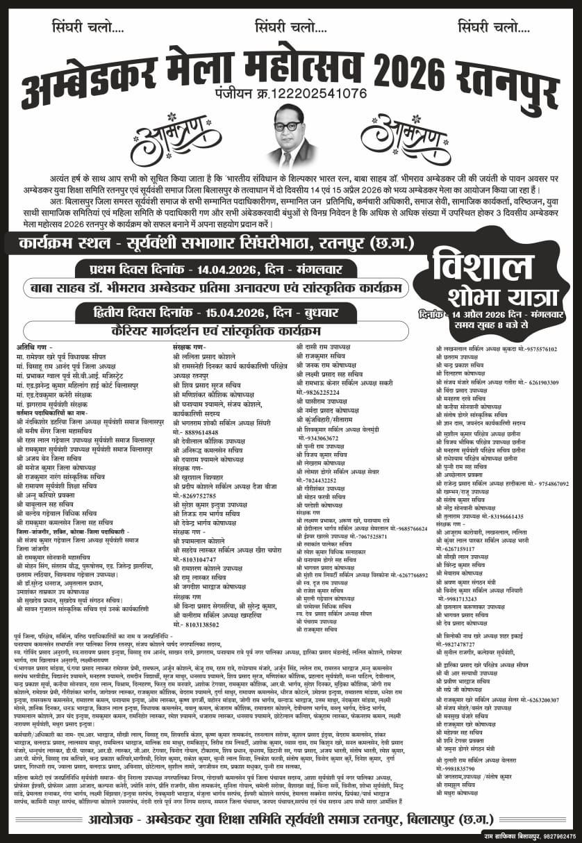 रतनपुर – भारतीय संविधान के शिल्पकार डॉ. भीमराव अंबेडकर की जयंती के अवसर पर रतनपुर में 14 एवं 15 अप्रैल को दो दिवसीय “अंबेडकर मेला महोत्सव 2026” का भव्य आयोजन किया जाएगा। यह आयोजन अंबेडकर युवा शिक्षा समिति एवं सूर्यवंशी समाज रतनपुर, जिला बिलासपुर (छत्तीसगढ़) के संयुक्त तत्वावधान में सूर्यवंशी सभागार, सिंधरीमाड़ा में संपन्न होगा। आयोजकों के अनुसार, महोत्सव का उद्देश्य बाबा साहब के विचारों को जन-जन तक पहुंचाना और समाज में शिक्षा, जागरूकता एवं सामाजिक समरसता को बढ़ावा देना है। कार्यक्रम में जिलेभर से जनप्रतिनिधि, सामाजिक कार्यकर्ता, युवा, छात्र-छात्राएं और आम नागरिकों की बड़ी भागीदारी रहने की संभावना है। महोत्सव के पहले दिन 14 अप्रैल को सुबह 8 बजे भव्य शोभा यात्रा निकाली जाएगी। यह यात्रा नगर के प्रमुख मार्गों से गुजरते हुए आयोजन स्थल तक पहुंचेगी, जिसमें आकर्षक झांकियां, बैंड-बाजे और विभिन्न समाजों की भागीदारी रहेगी।