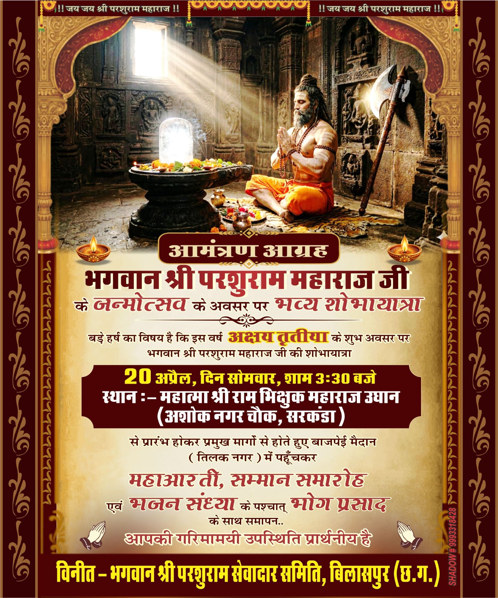 बिलासपुर – अक्षय तृतीया पर इस बार सरकंडा क्षेत्र भगवा रंग में रंगने की तैयारी में है। भगवान परशुराम जयंती को लेकर ब्राह्मण समाज और सेवादार समितियों ने पूरी ताकत झोंक दी है। पहली बार आयोजित हो रही इस भव्य शोभायात्रा को ऐतिहासिक बनाने के लिए शहर से लेकर ग्रामीण अंचलों तक बैठकों का दौर पूरा हो चुका है और हजारों विप्र जनों के शामिल होने का दावा किया जा रहा है।